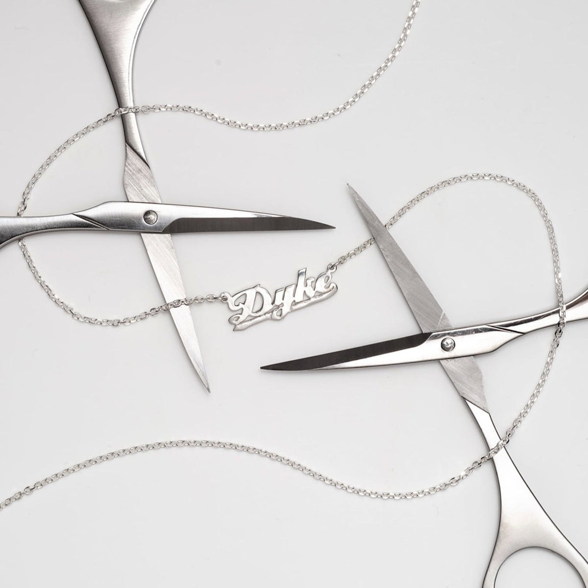 This necklace is made from 925 sterling silver and features a 1-inch wide name plate with the word "Dyke." It comes on a 16 or 20-inch chain. Made in NYC.