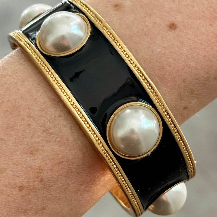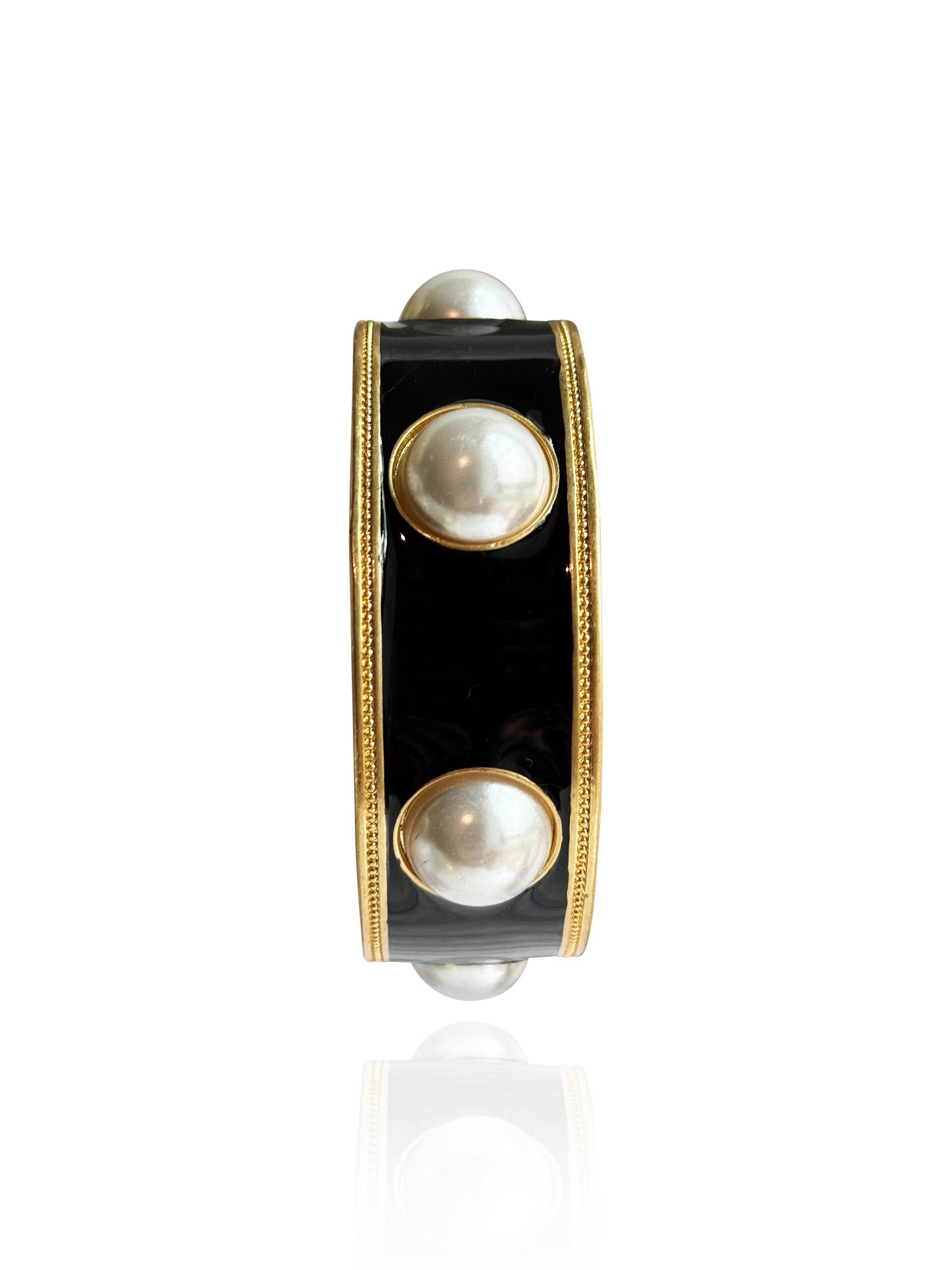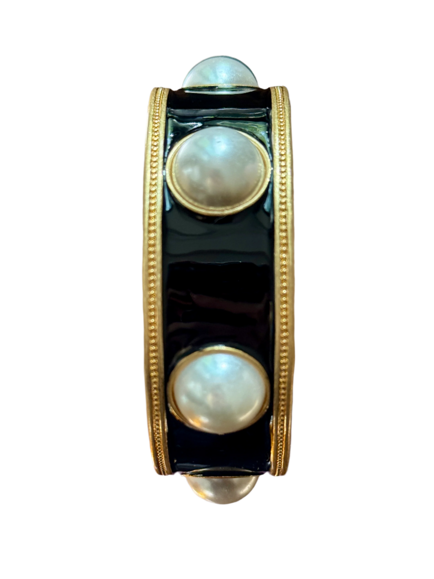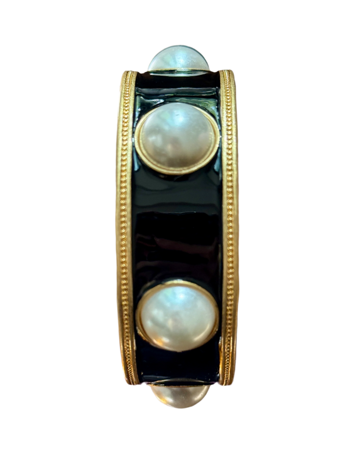 This bangle is a gold-plated stacking bangle made of 14k gold-plated brass. It features glassy black enamel and vintage faux pearls. It should be handled with care and cleaned with a microfiber cloth.