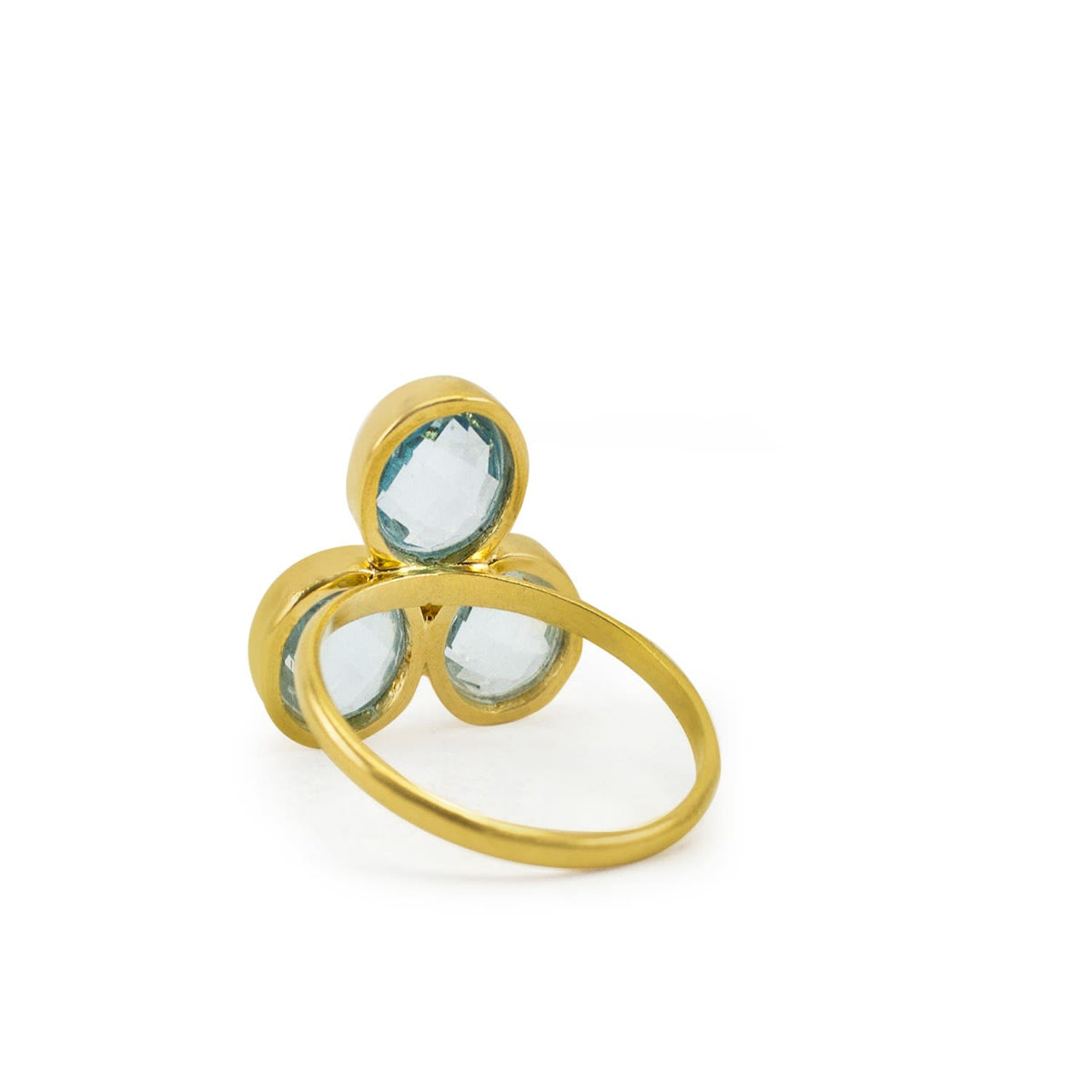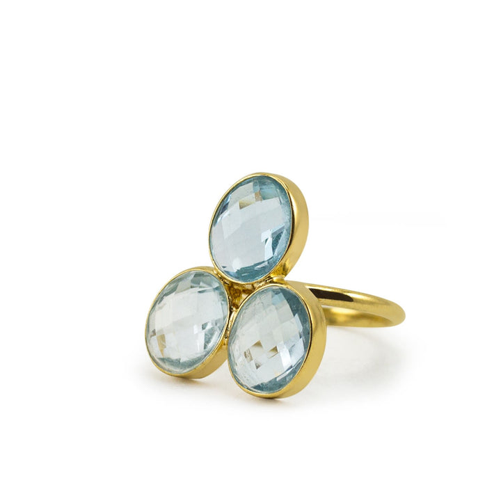 Handmade in Italy from 18k gold-plated sterling silver (1 micron plating), set with three natural sky blue topaz gemstones. Nickel-free and compliant with EU Reach/RoHS directives.