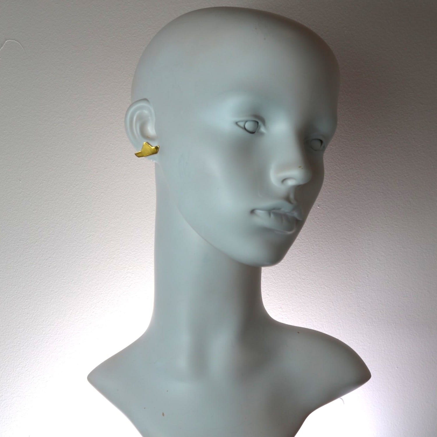 These mismatched earrings are 23K gold plated on nickel-free brass, copper, and surgical steel. The charms are hand-cut and distressed.