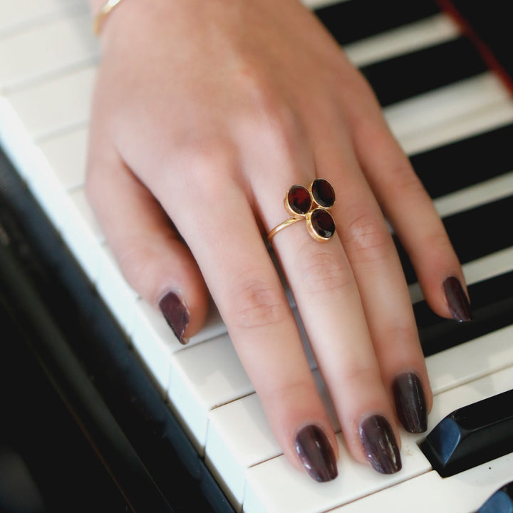 This Pompei Garnet Gold Ring by Vintouch Italy is inspired by southern Italy’s vibrant landscapes. Handmade in Italy, it features three glowing garnets set in rich gold vermeil, symbolizing vitality and joy. Elegant and understated, it transitions seamlessly from daywear to evening sophistication.
