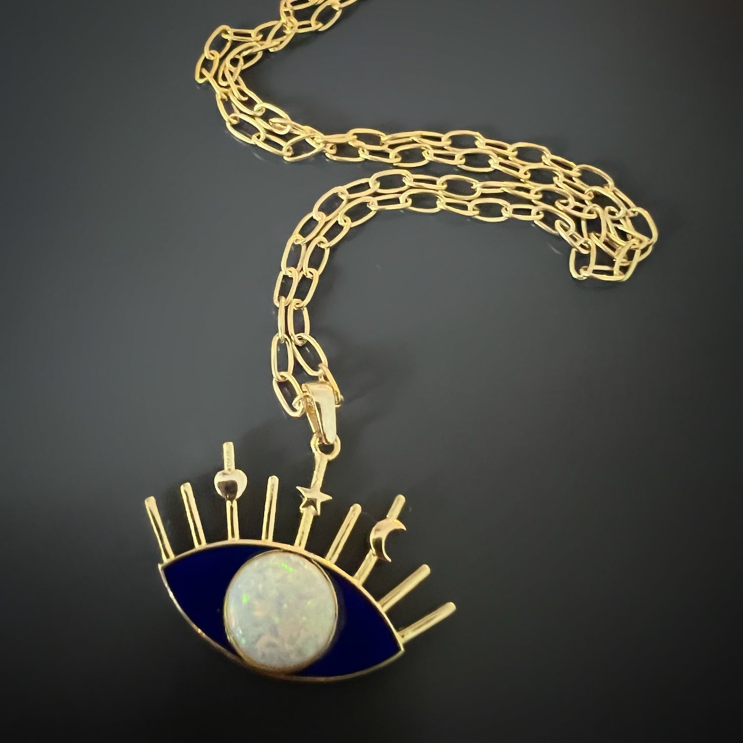 This necklace is made from sterling silver with an 18k gold plating. It features a pendant adorned with blue enamel and white opal. The necklace is 16 inches long with a 3-inch extender, and the pendant is 0.7 inches high and 1 inch wide.