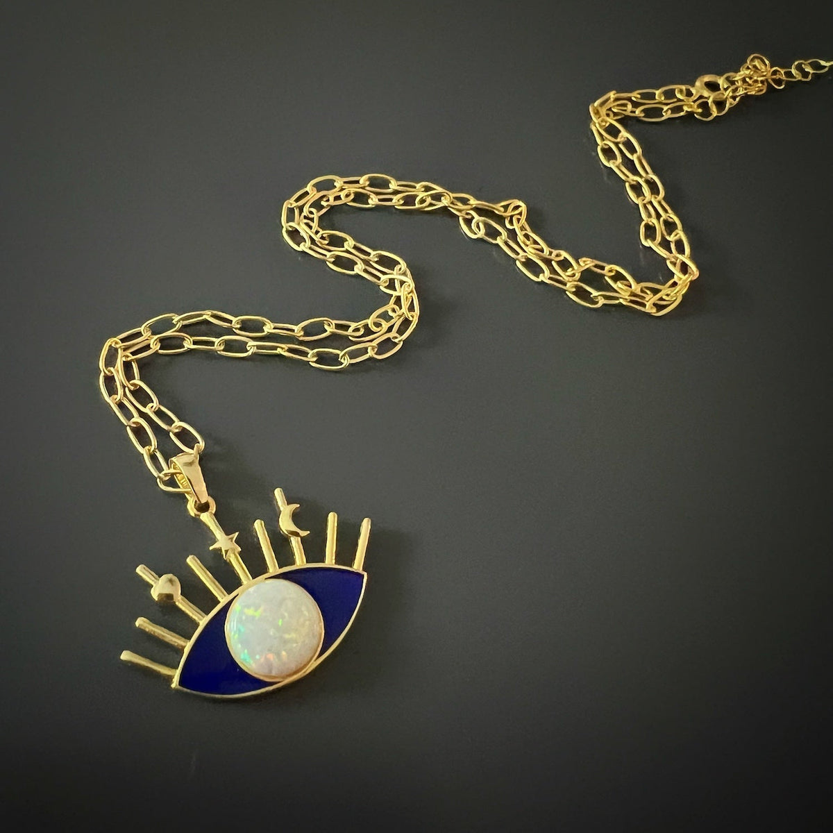 This Opal Blue Evil Eye Necklace by Ebru Jewelry is a mesmerizing piece that combines spiritual symbolism with captivating elegance. The centerpiece is an enchanting evil eye pendant, a powerful talisman believed to protect against negative energies and bring good fortune. Adorned with a striking combination of blue enamel and white opal, the pendant creates a beautiful contrast that draws the eye. This necklace is a stylish way to carry the protective qualities of the evil eye, blending deep cultural significance with a modern, beautiful aesthetic.