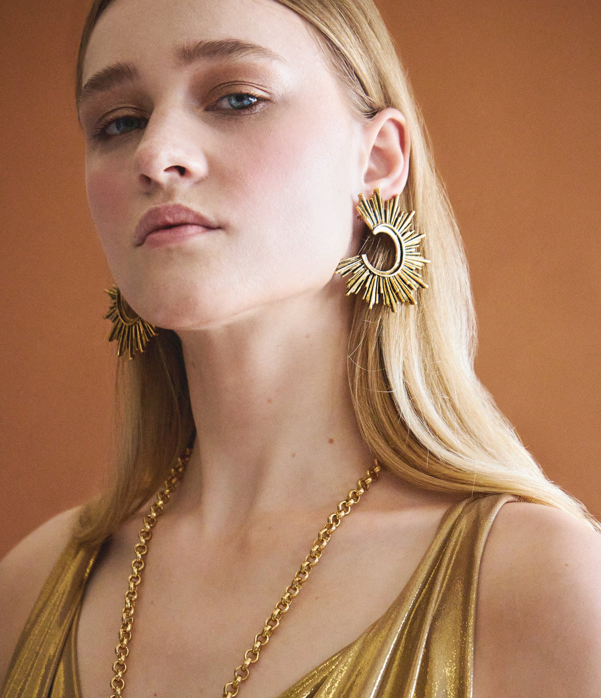 These earrings are a crescent-shaped sunburst design and are available in silver and gold-plated.