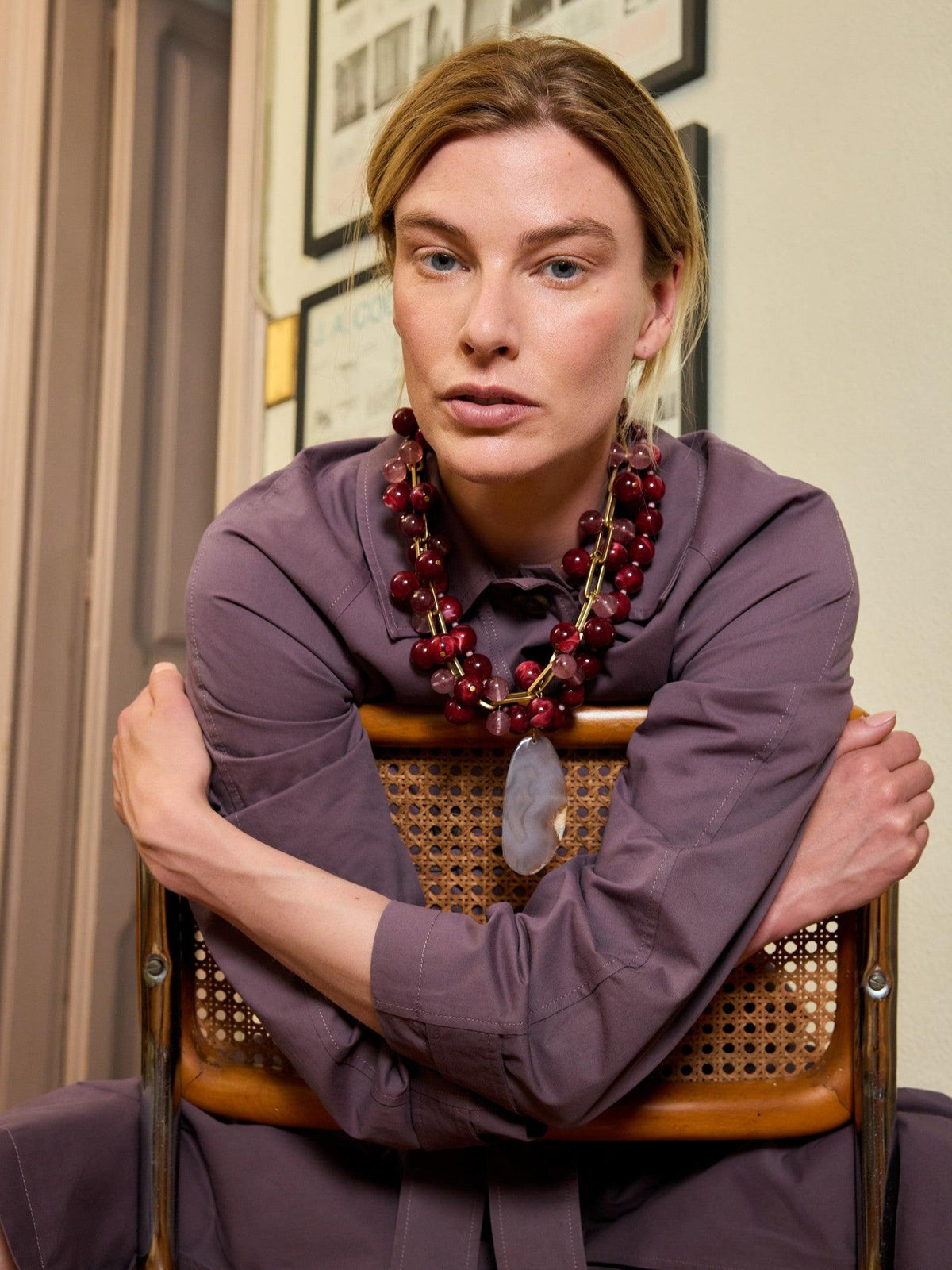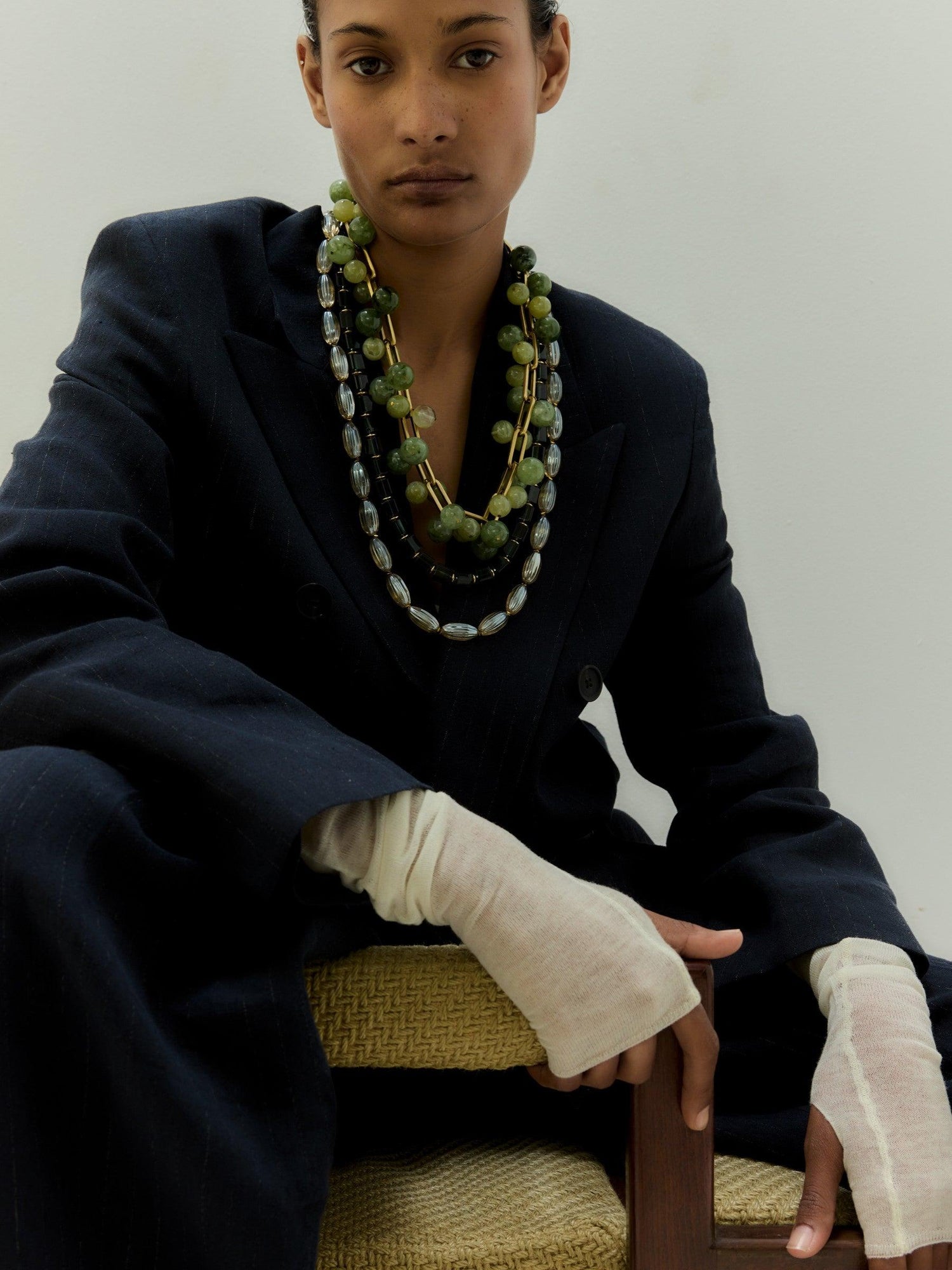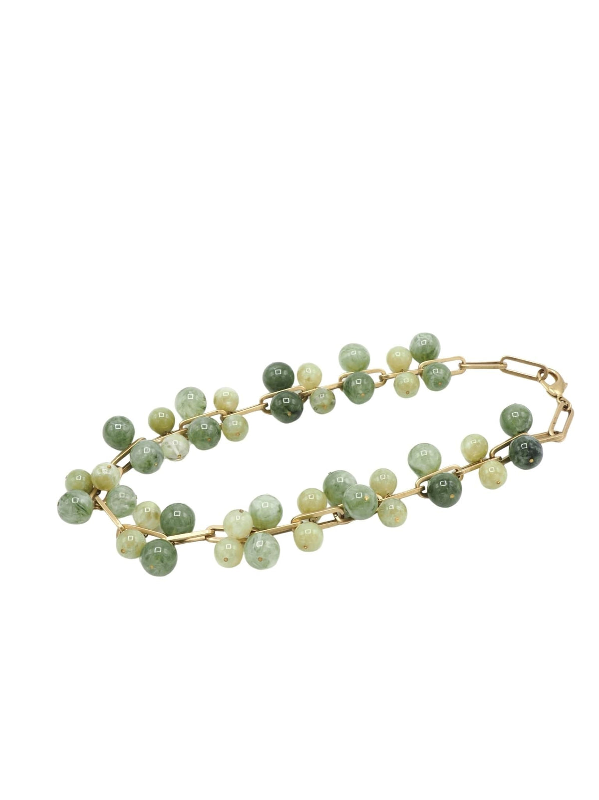 This half-chest necklace is made with an oval brass ring chain and natural stone beads. It is 60cm long and weighs 200g.