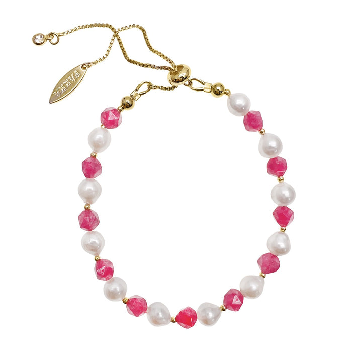 This adjustable bracelet is made of freshwater pearls, rhodochrosite gemstones, and 14K gold plated brass.