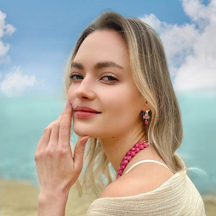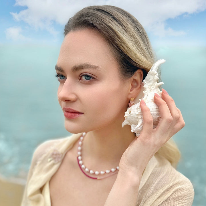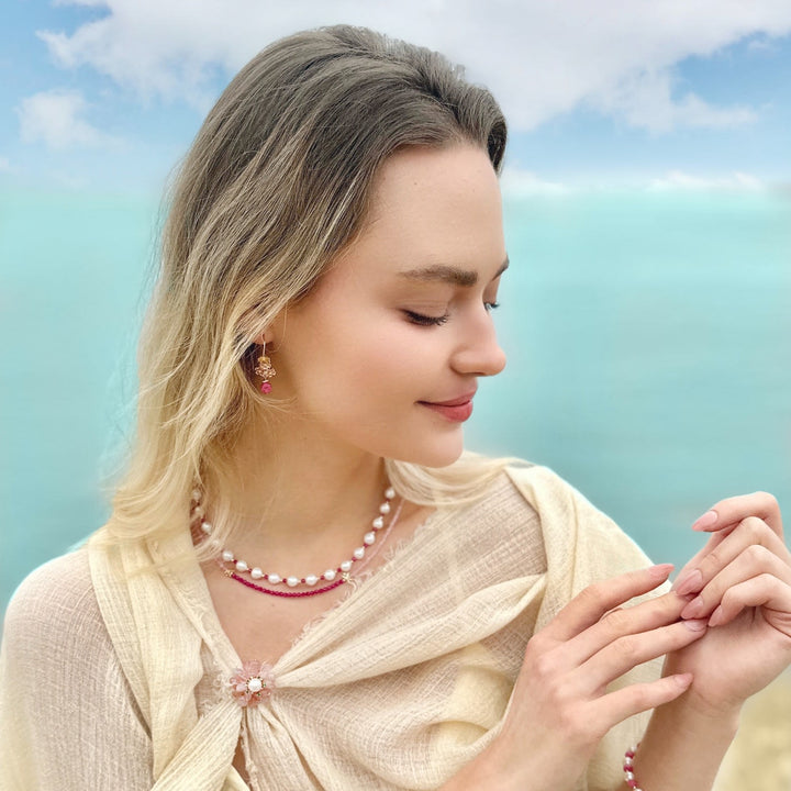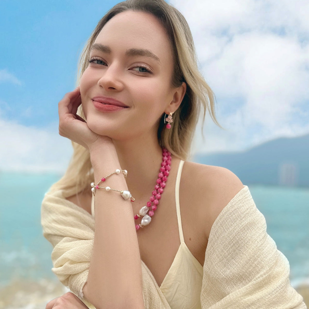 This Freshwater Pearls And Pink Rhodochrosite Adjustable Bracelet by Farra is a stunning piece that blends elegance and natural beauty. It features lustrous freshwater pearls and the delicate pink hues of rhodochrosite gemstones, known as the "Stone of Love." This bracelet is a versatile and elegant choice for any occasion, from a special event to everyday wear.