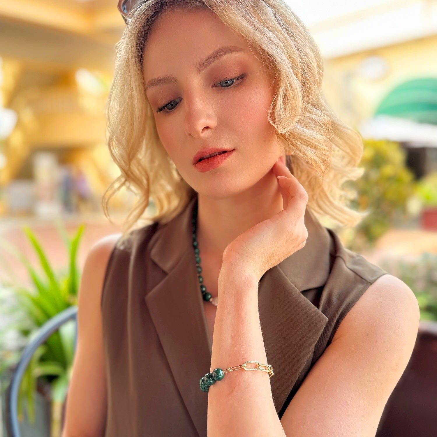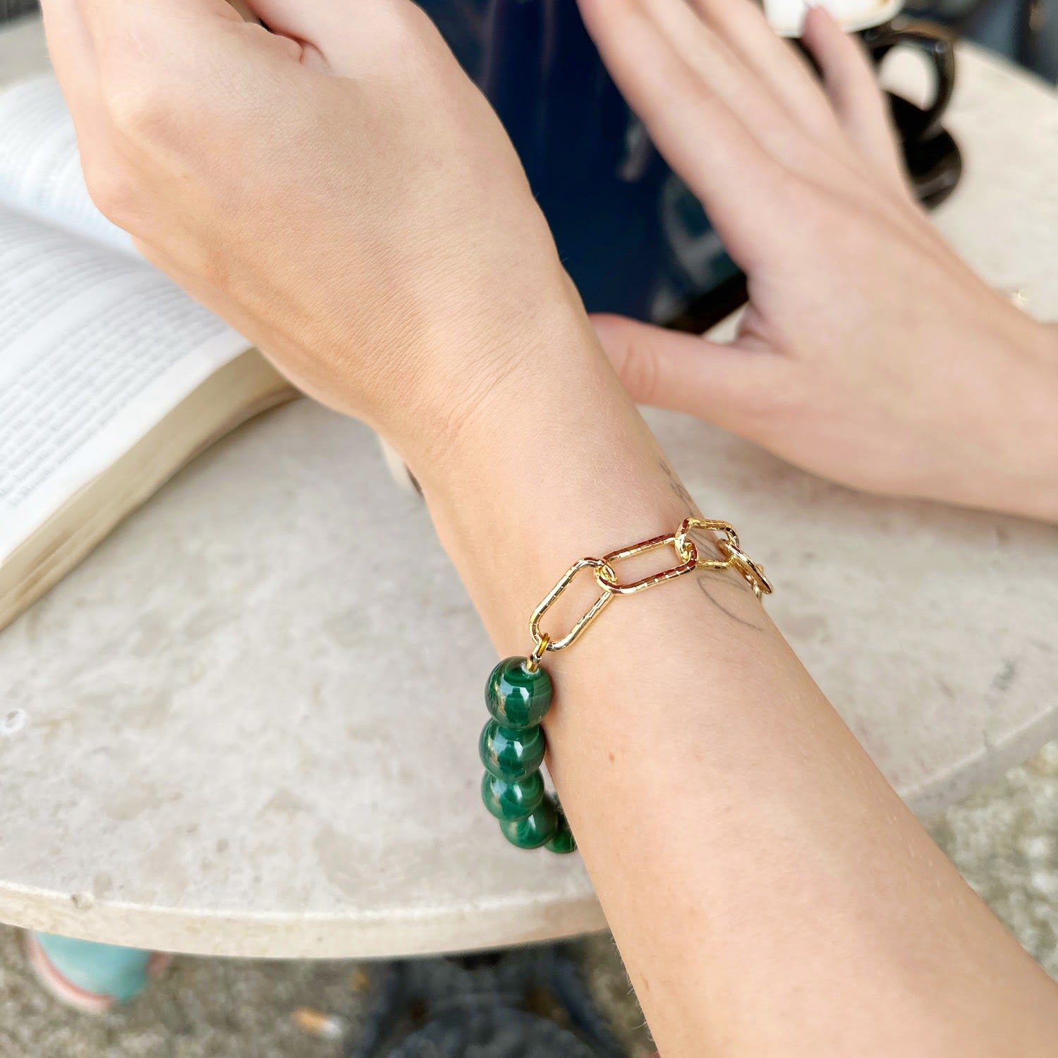 This bracelet features a round malachite stone with Japan golden-plated brass findings. It has an adjustable chain.