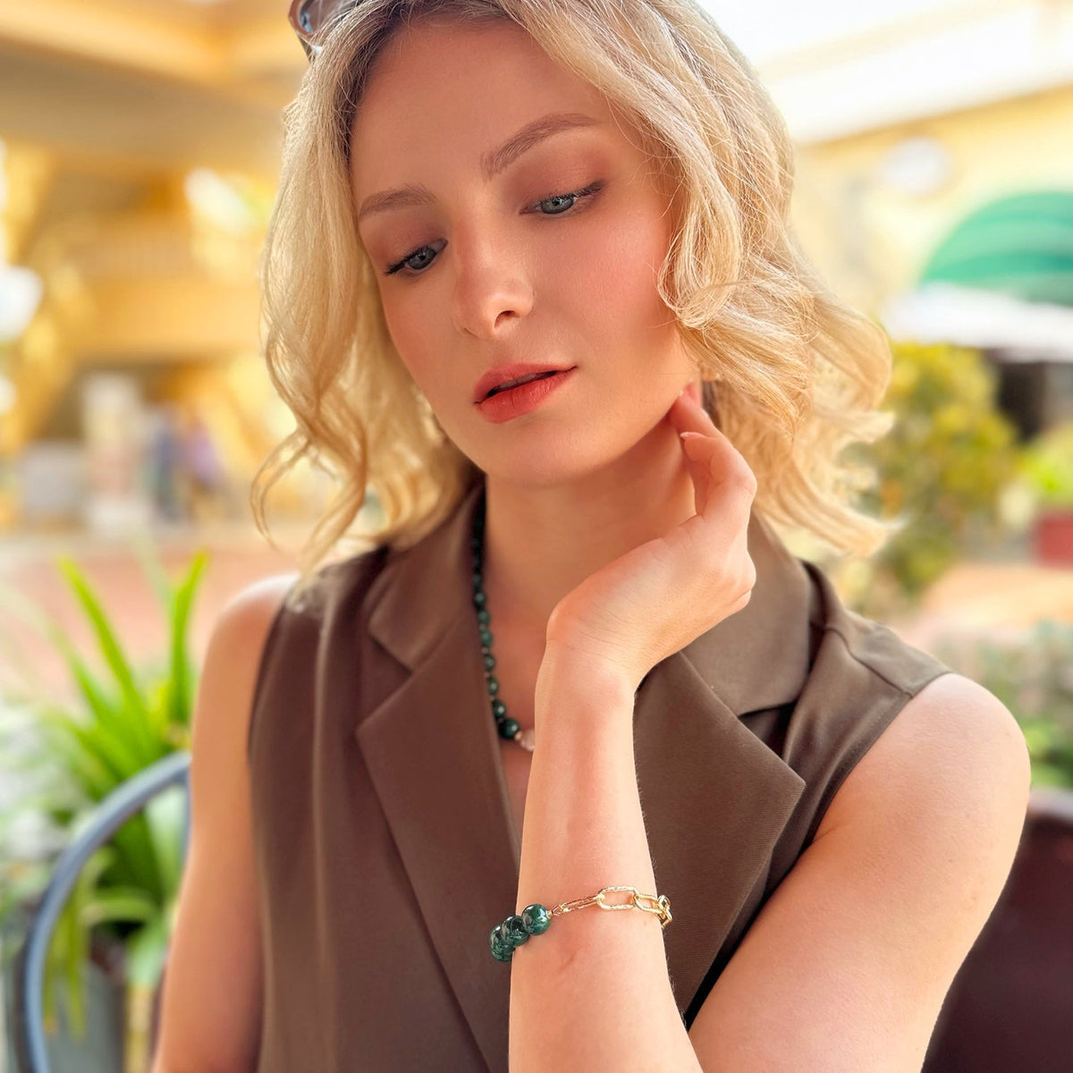 This Round Malachite Adjustable Chain Bracelet by Farra is a stylish and modern piece that features the beautiful, protective energy of malachite. The round malachite stone is set in an elegant design, making it a versatile accessory for any occasion. This bracelet is not only a beautiful addition to your collection but is also believed to provide protection and cleanse negative energies.