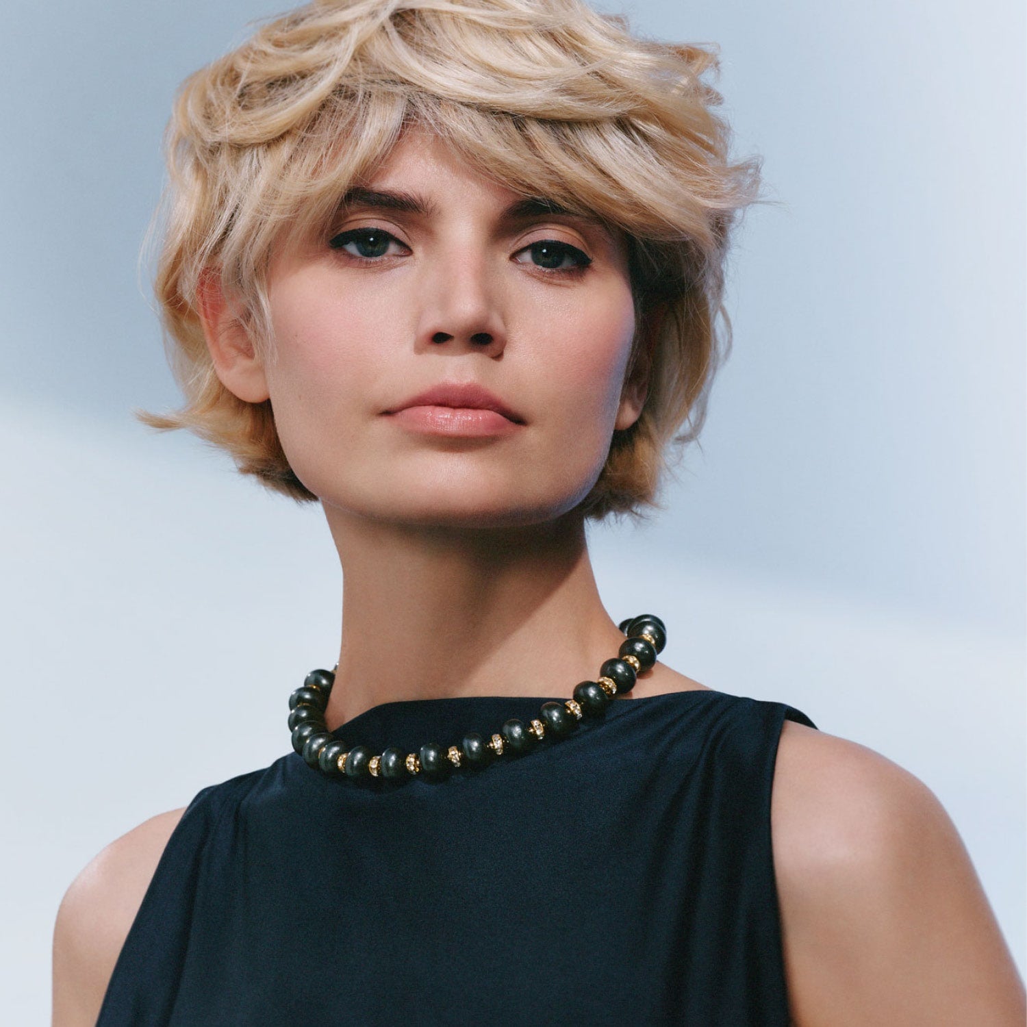 This Mika Necklace by Saule Label in Black Coral brings an effortless touch of elegance to your neckline. This piece seamlessly combines metallic sparkle with hand-painted artistry, featuring a string of oval wooden beads accented by shimmering crystal rondelles. Its magnetic closure, crafted from 18K gold or silver-plated brass with cubic zirconias, provides a sophisticated and easy-to-use finish.