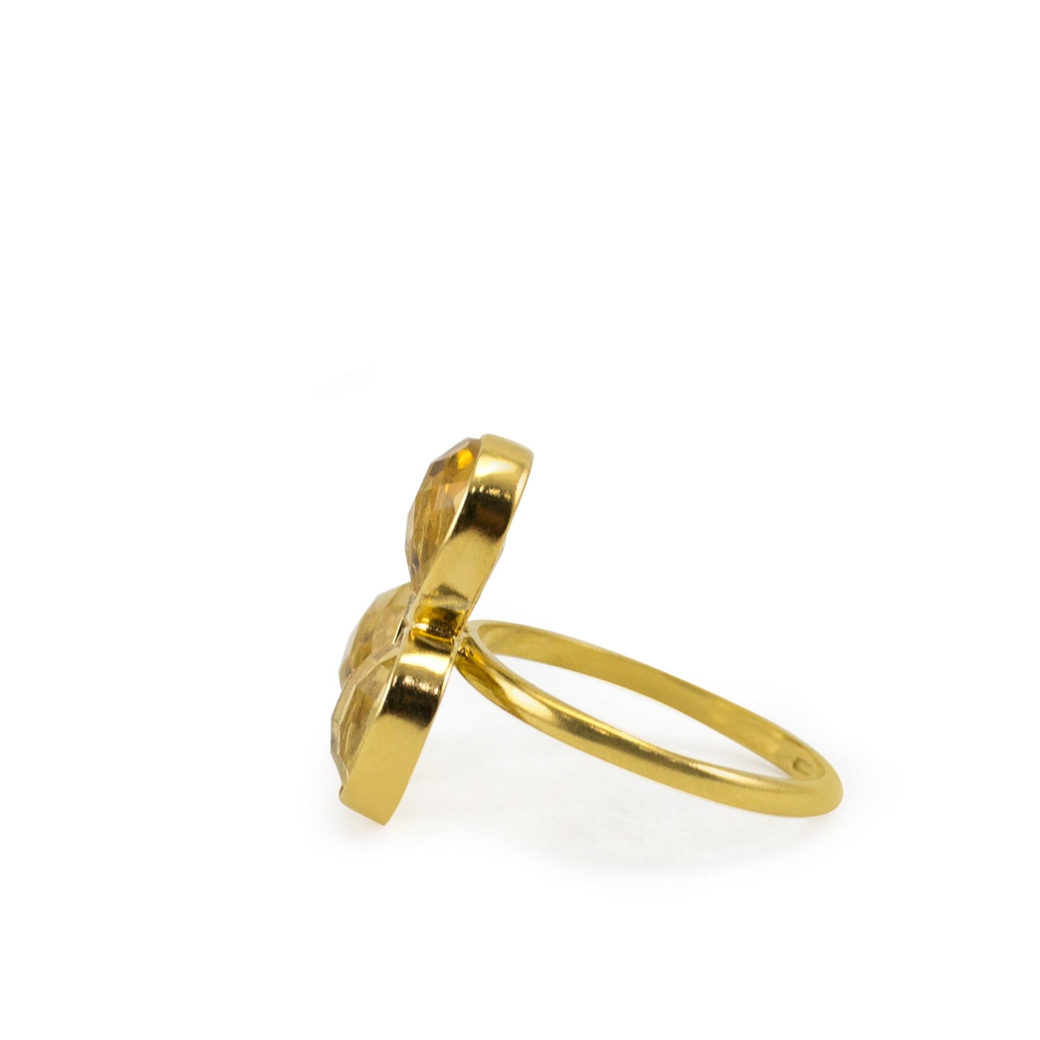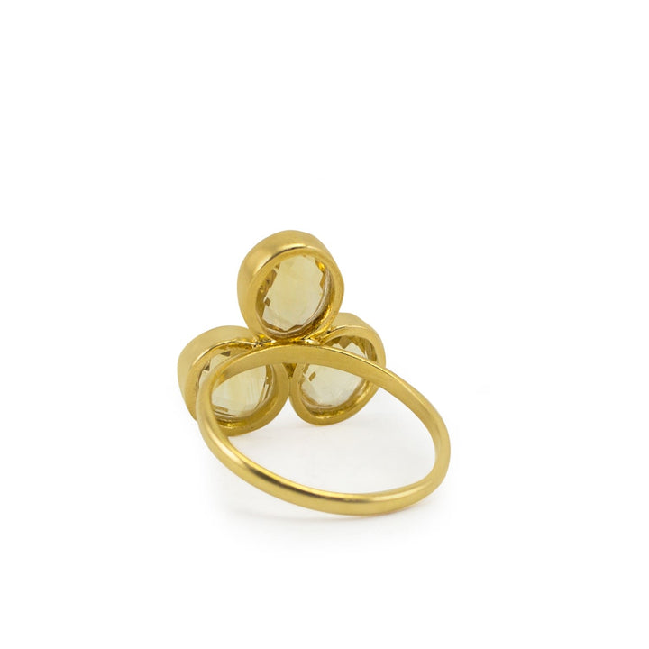 This ring is handcrafted in Italy from 18K gold vermeil and is set with three citrine gemstones.