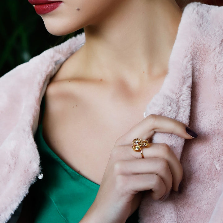 This Capri Citrine Gold Ring by Vintouch Italy is an understated and elegant piece that radiates luxury. Handcrafted in Italy, the ring features a trio of vibrant citrine stones, known as the "Success stones" for their properties of wealth and abundance. The electric yellow hues of the gems are inspired by the stunning landscapes of Southern Italy, adding a touch of Mediterranean charm to the design. This ring is a versatile piece that effortlessly complements any look, from day-to-day wear to more sophisticated evening ensembles, making it a staple of refined style.