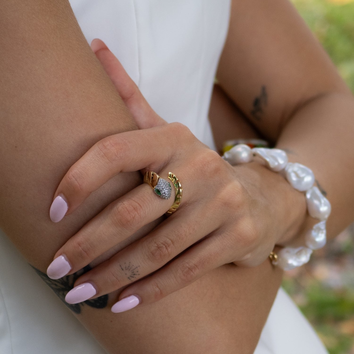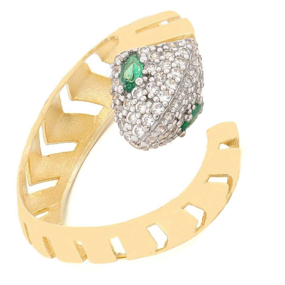 This Guardian Snake Emerald Eyes Gold Ring by Ebru Jewelry is a striking accessory that allows you to channel ancient wisdom and powerful protection. Crafted from sterling silver and plated in radiant 14K gold, this ring features a detailed serpent head with sparkling cubic zirconia and vivid emerald-inspired eyes. Its adjustable open band ensures a comfortable fit, making it a beautiful piece that is perfect for day-to-night wear.