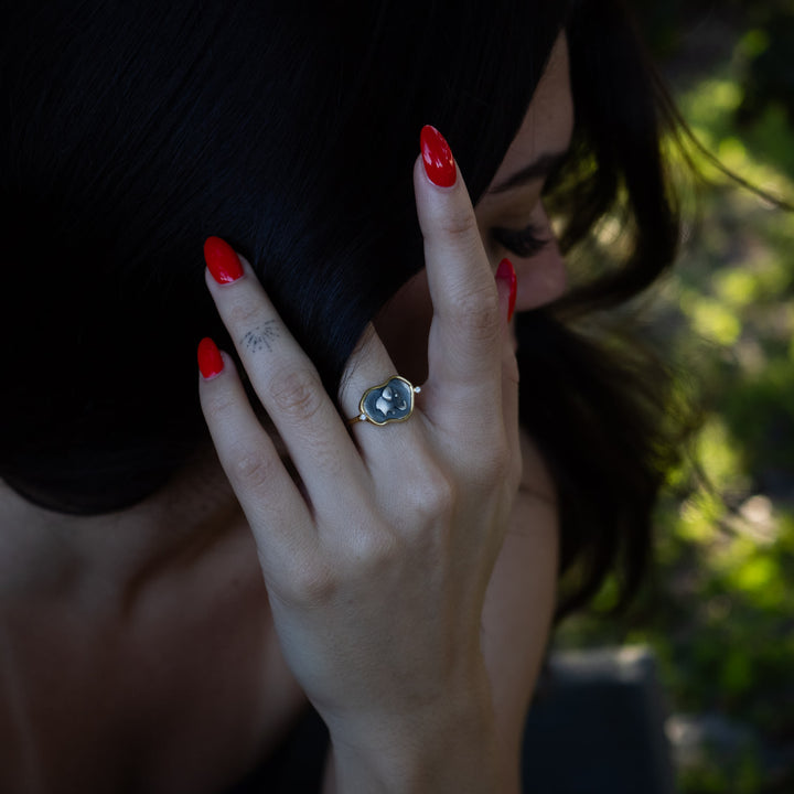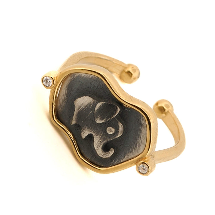 This signet ring is made of 925 Sterling Silver with an 18K gold plated on sterling silver border. It is adjustable from size 5.5 to 9. The design features an engraved lucky elephant.