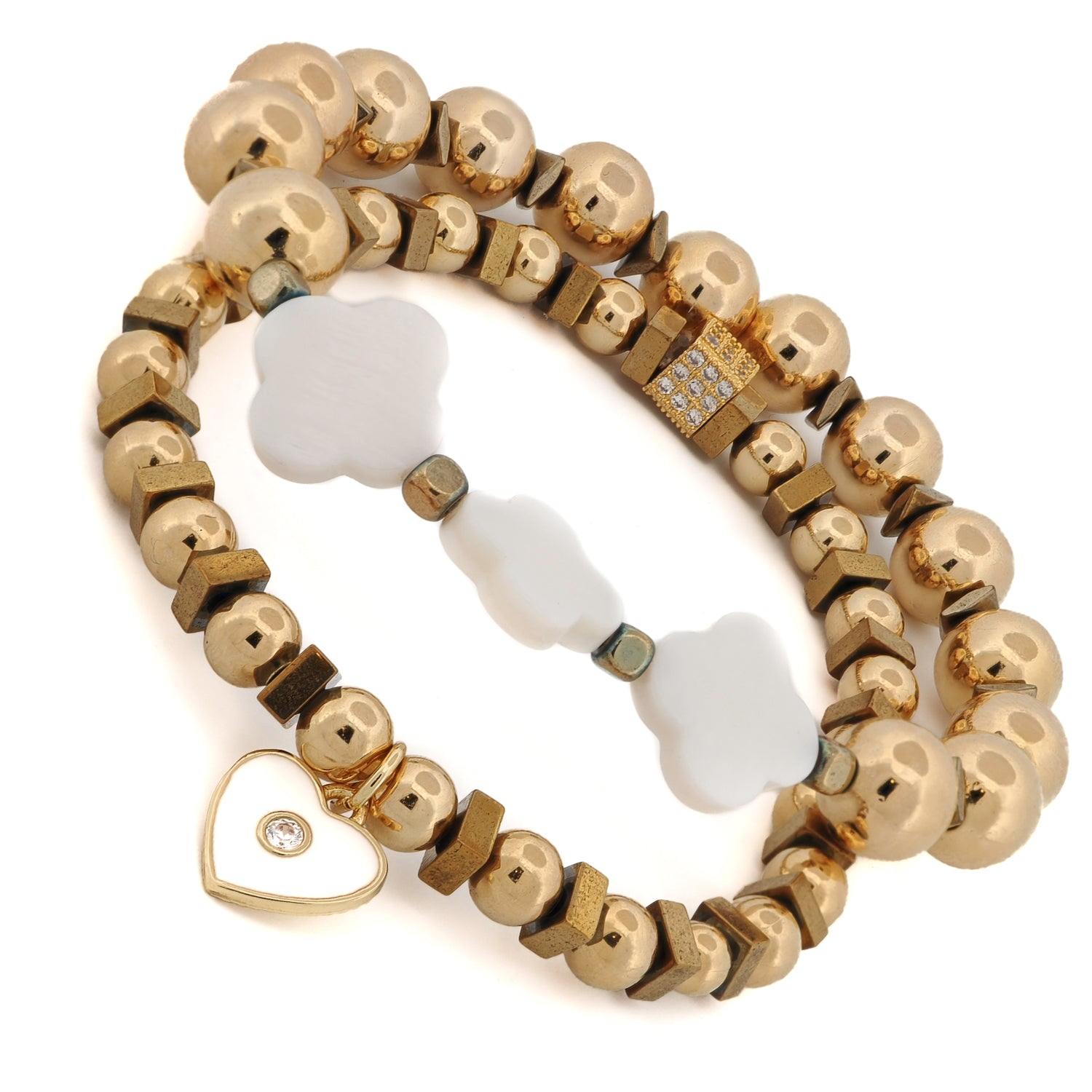 Spiritual Heart & Lucky Clover Gold Beaded Bracelet Set - White