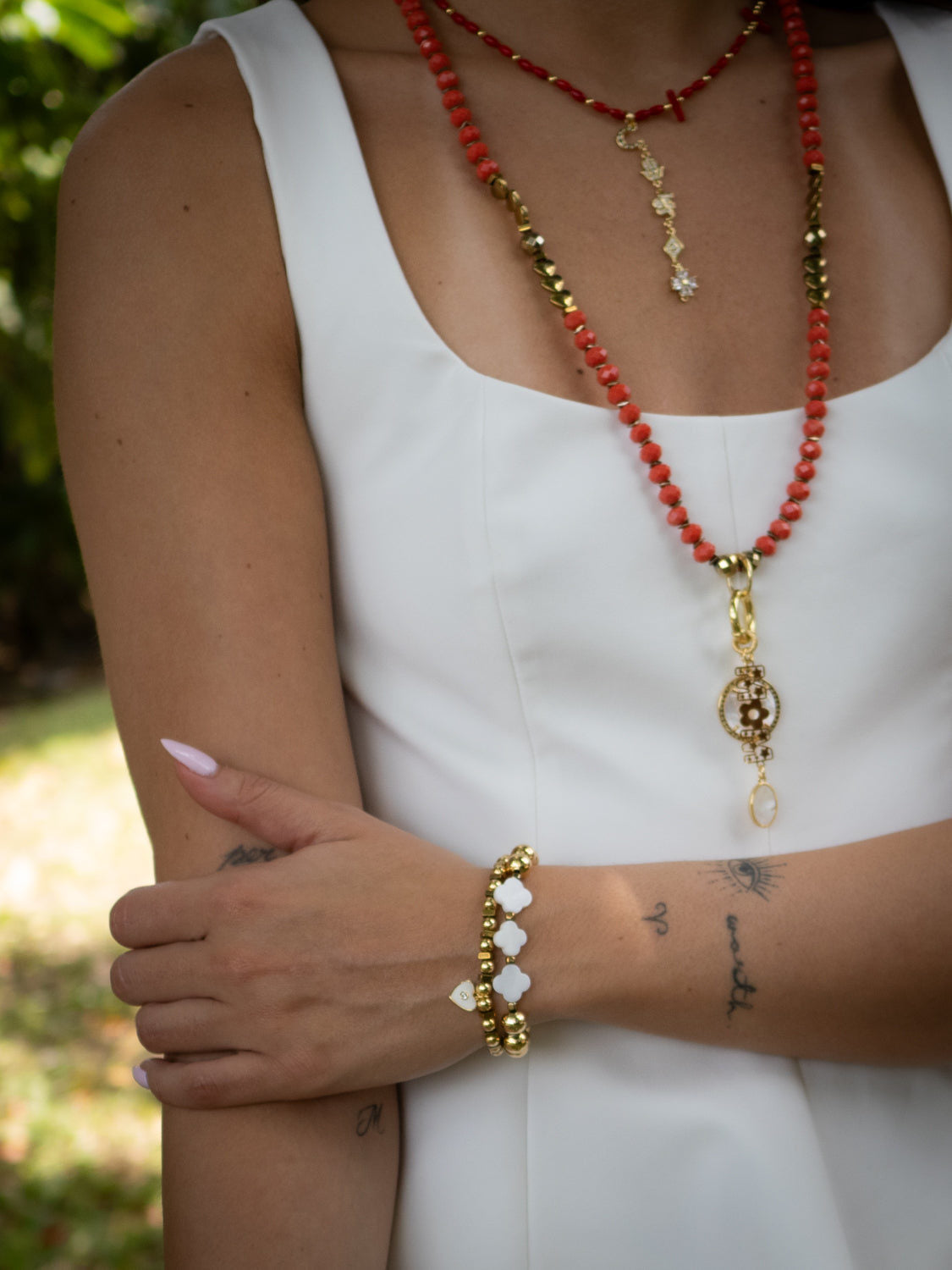 The Spiritual Heart & Lucky Clover Gold Beaded Bracelet Set by Ebru Jewelry is a meaningful blend of love, protection, and good fortune. This elegant set features 18K gold plated beads and white pearl clover beads. One bracelet is adorned with a white enamel 18K gold plated heart charm, symbolizing pure love, while the second features mother-of-pearl clover beads for luck and harmony. A sparkling Swarovski crystal bead adds a radiant touch.