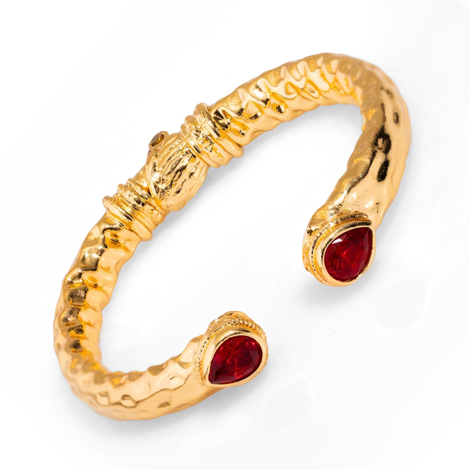 This bracelet is crafted from 24-karat gold-plated brass and features ruby stones. The bracelet size is 7 inches.