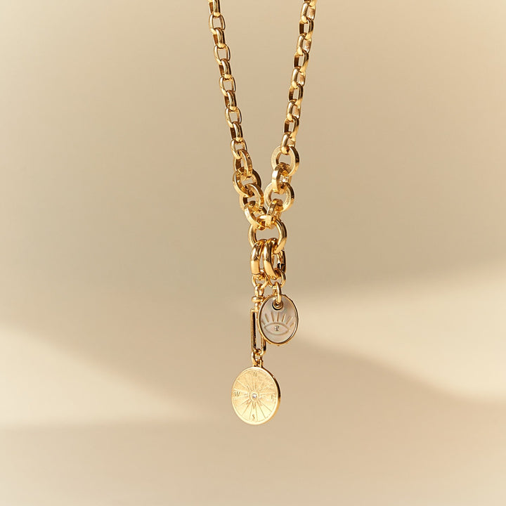 The Voyager Necklace by Mignonne Gavigan is a best-selling layering piece from the Charms Collection. It embodies a mix of sophistication and playfulness with its streamlined minimalism and subtle variations in chain details. The necklace includes charms for protection and travel, making it a promise of safe journeys ahead.