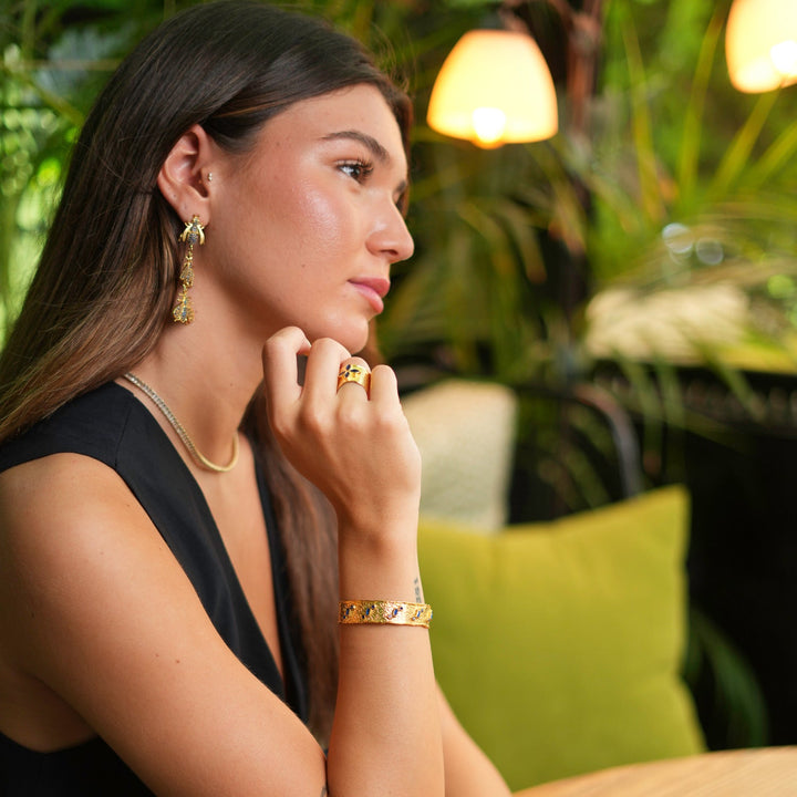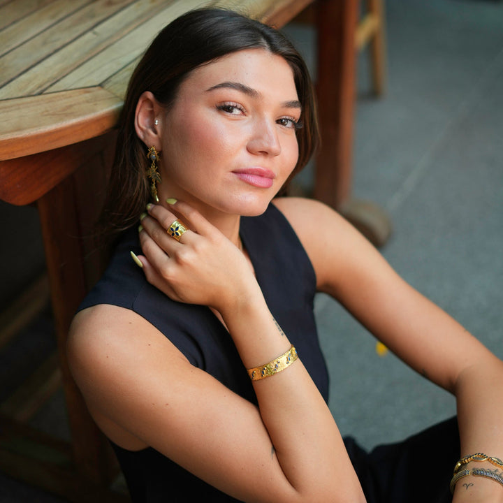 This Floral Sapphire Stone Gold Band Design Statement Ring by Ebru Jewelry is designed to make a bold fashion statement. The wide band ring is crafted from 24K gold-plated brass and features stunning sapphire stones in an intricate floral pattern. Its chunky, adjustable cuff design ensures a comfortable and versatile fit for any finger. This ring is a perfect accessory for those who love a chic and stylish look with a touch of luxury.