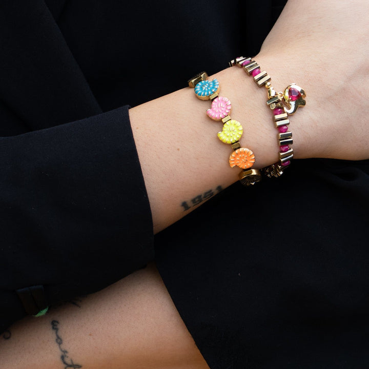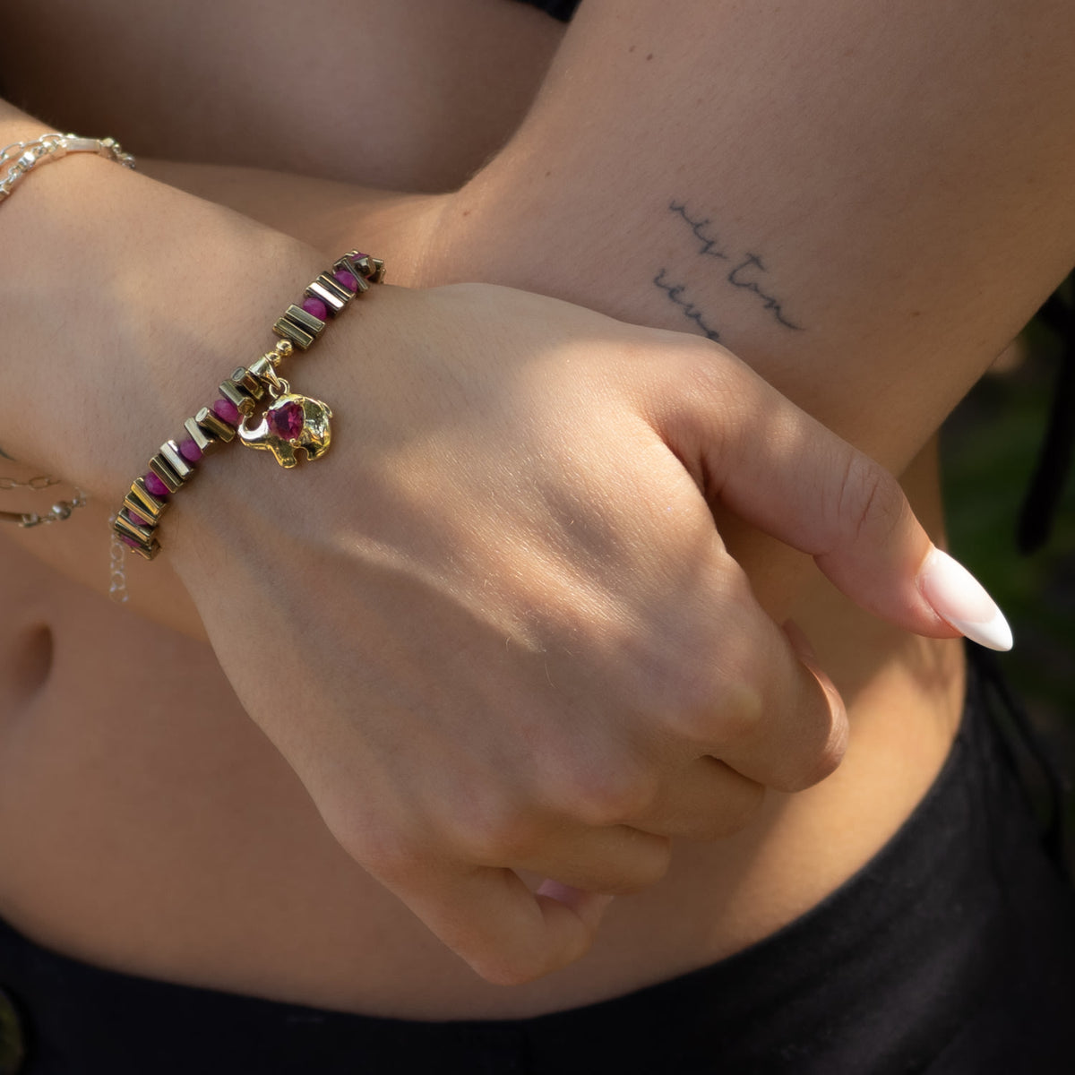 This Guardian Love Ruby Heart & Gold Elephant Bracelet by Ebru Jewelry is a meaningful and beautiful accessory. The design features pink Swarovski crystal beads and gold hematite stones, known for their grounding properties. At the center is a stunning 18K gold-plated elephant charm with a ruby heart-shaped stone. This bracelet symbolizes strength, wisdom, and deep love, making it a radiant and uplifting accessory.