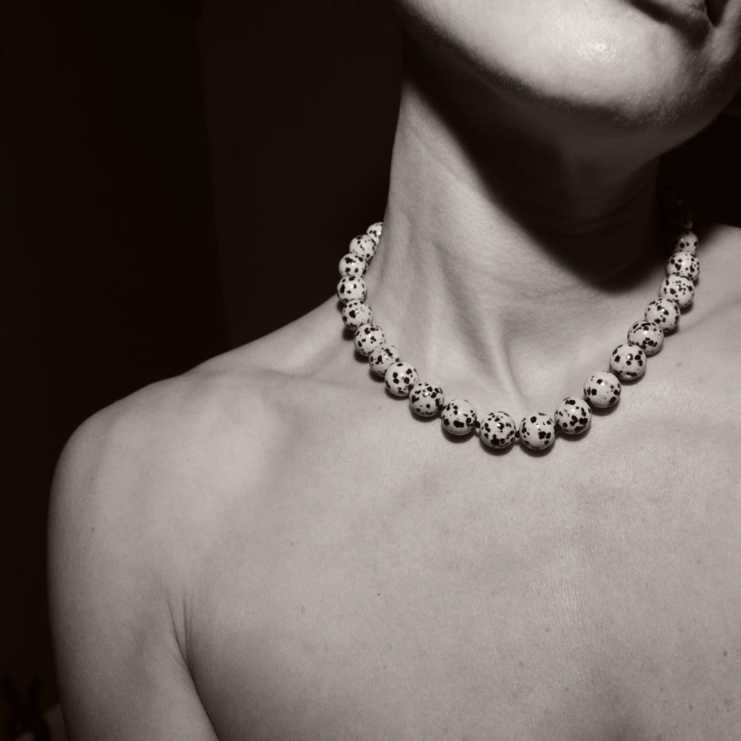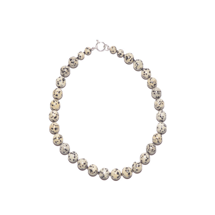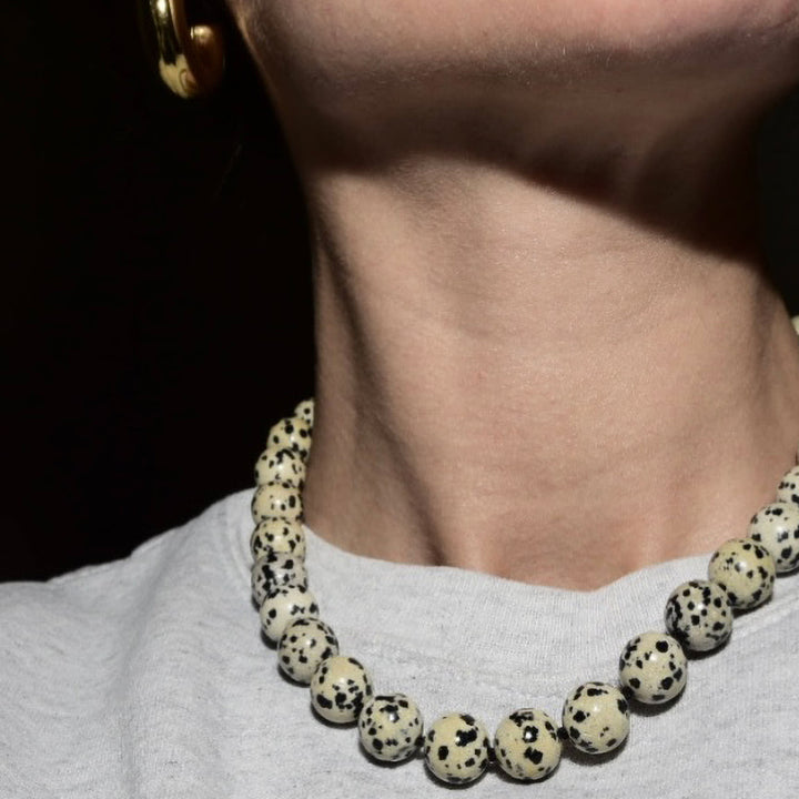 The Galleta Dalmatian Jasper Necklace by Studio Solíz is a quiet yet charming statement piece. It is hand-strung with natural Dalmatian jasper stones, which are known for balancing stability and levity. Each bead has a spontaneous pattern, like freckles or sunlight, adding a unique character to the necklace. It rests just below the collarbone and is a beautiful reminder of presence and imperfect beauty.