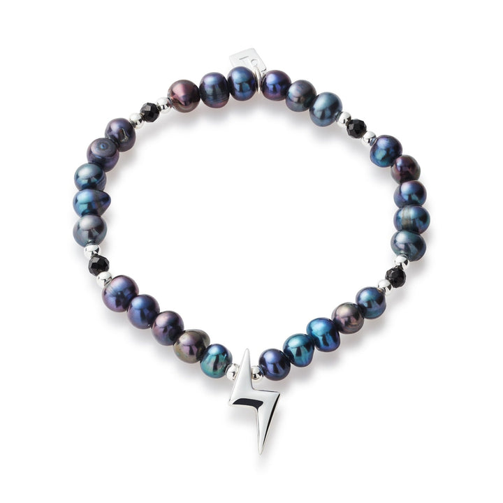 This bracelet is made with dark, iridescent peacock pearls and black onyx beads. It features a central sterling silver bolt pendant and is strung on a strong elastic string.