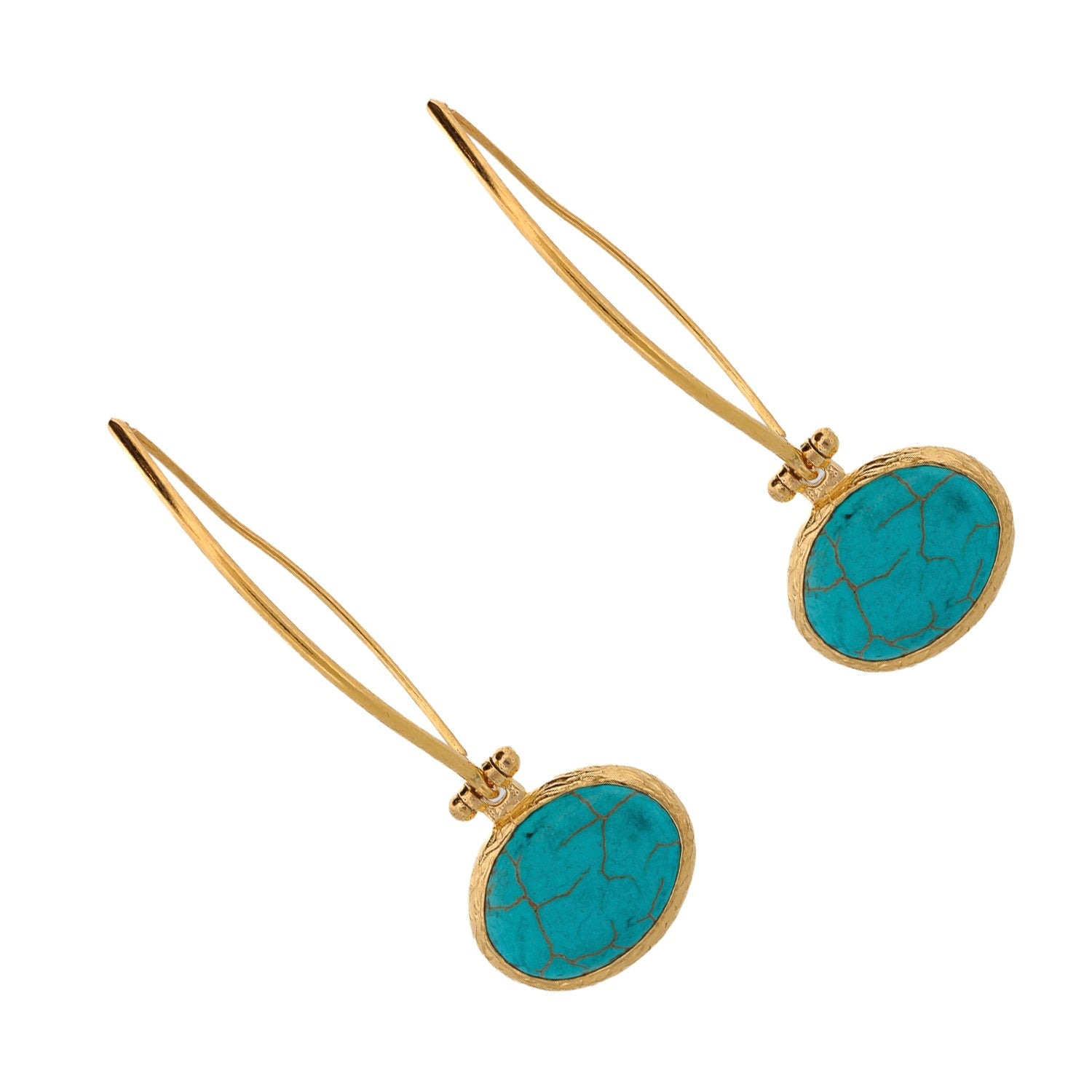 These dangle earrings are made with turquoise stones and 18k gold-plated brass.