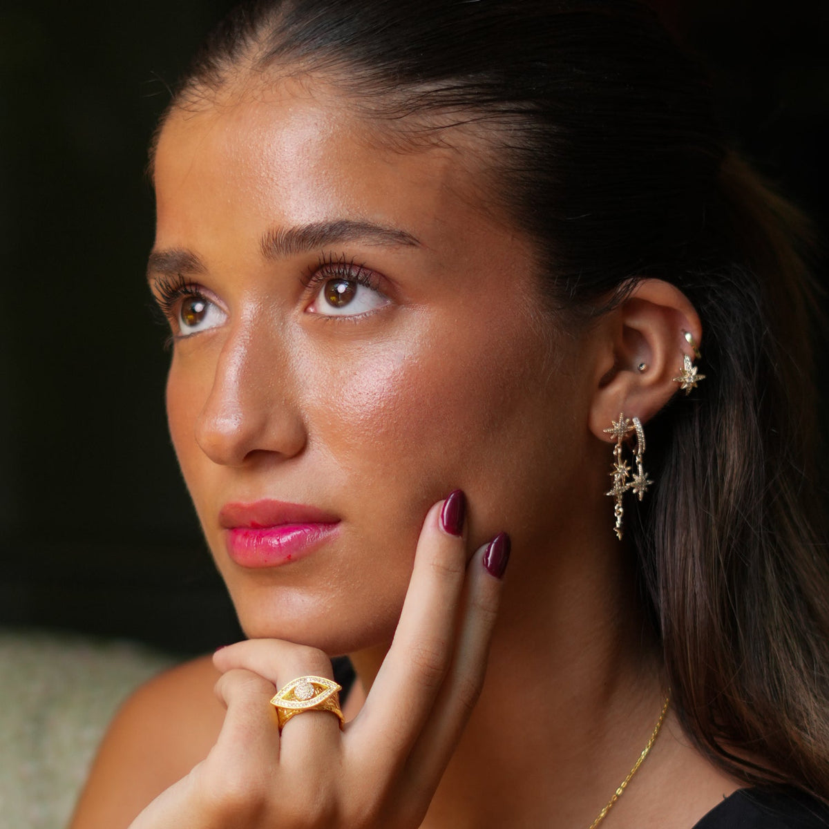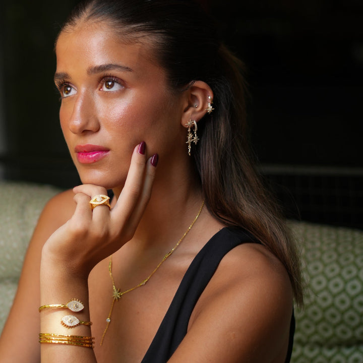 This Diamond Evil Eye Design Gold Adjustable Statement Ring by Ebru Jewelry merges elegance with protection. The eye motif, set with sparkling CZ diamonds, serves as a guardian against negativity while remaining a fashion-forward statement. With its adjustable band, it combines comfort, symbolism, and bold design in one radiant piece.