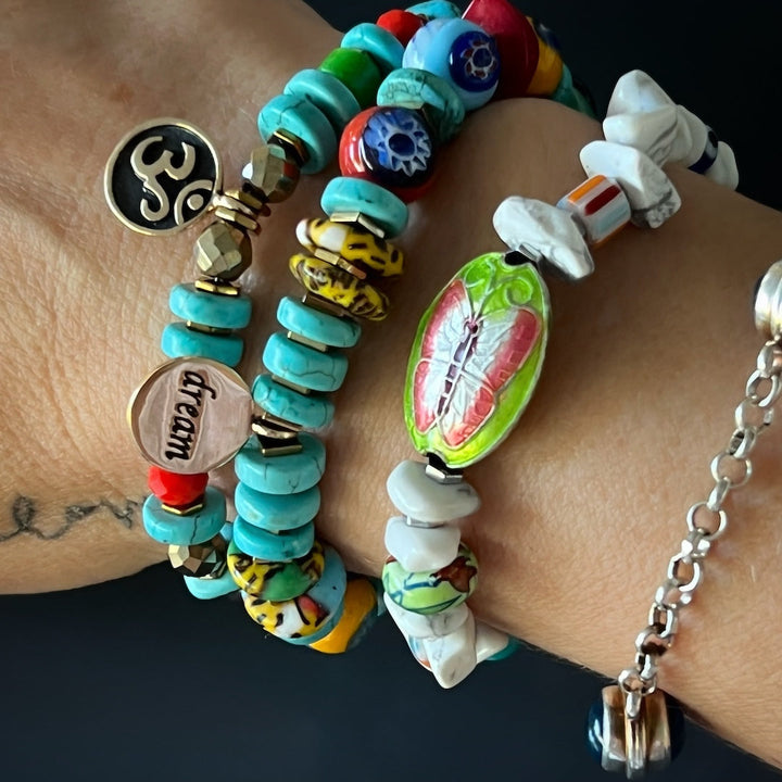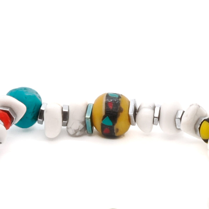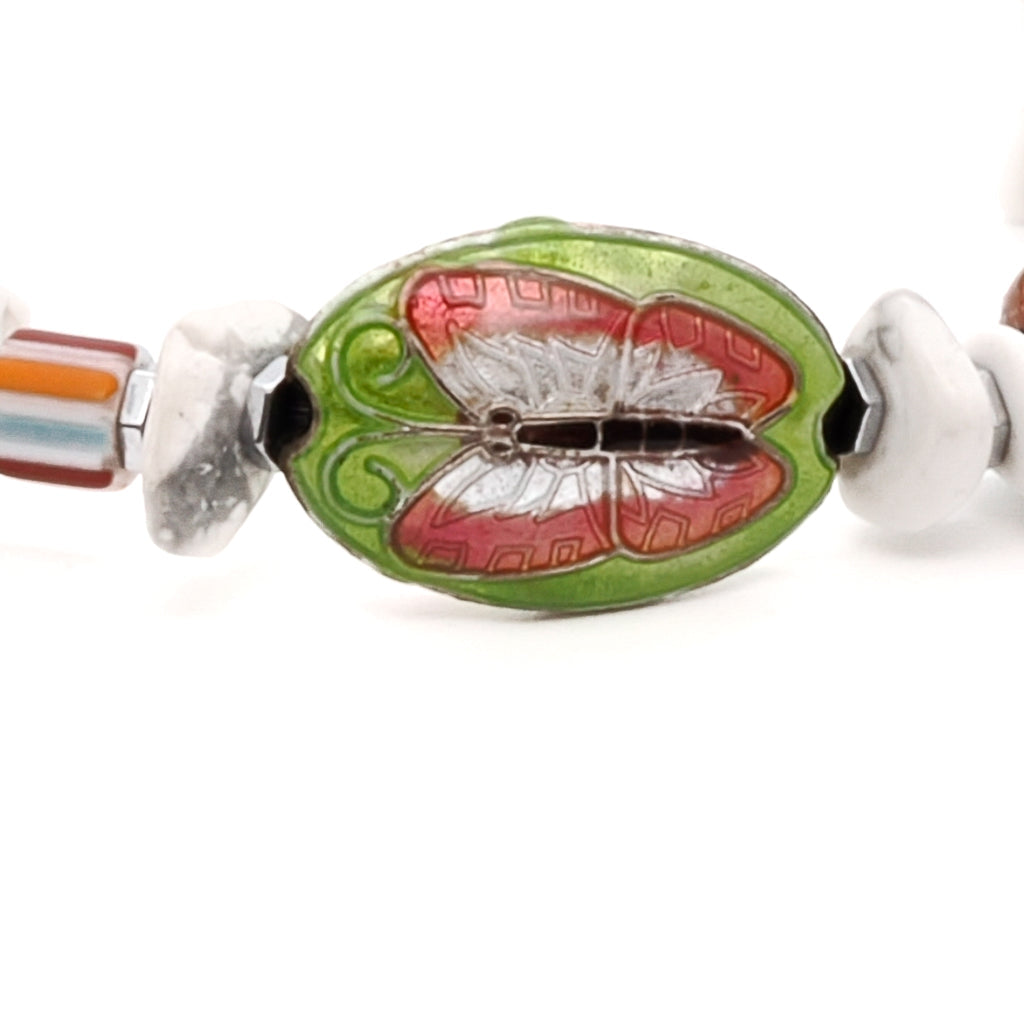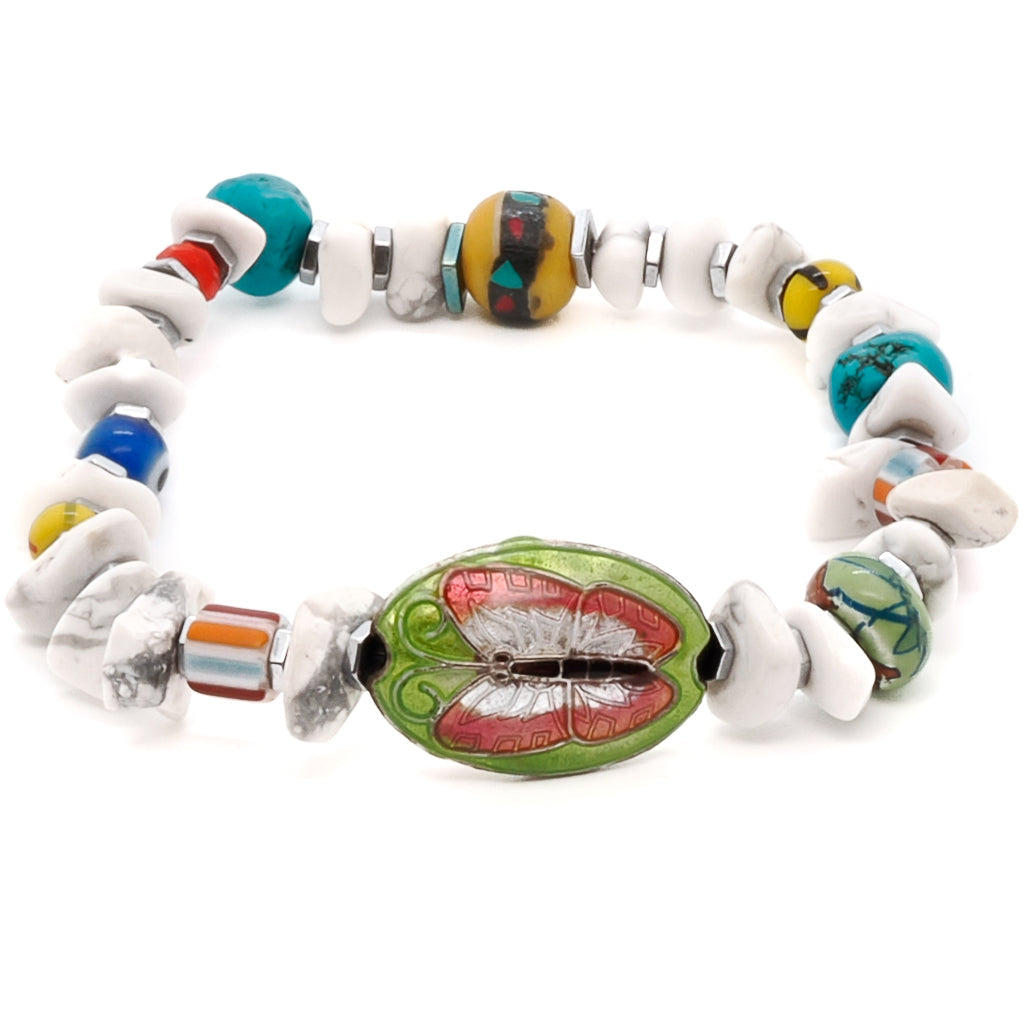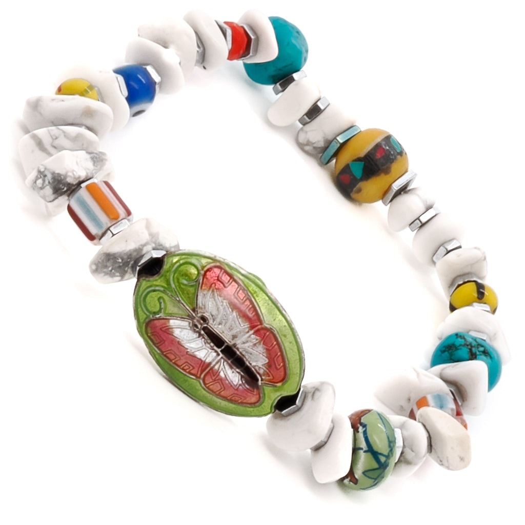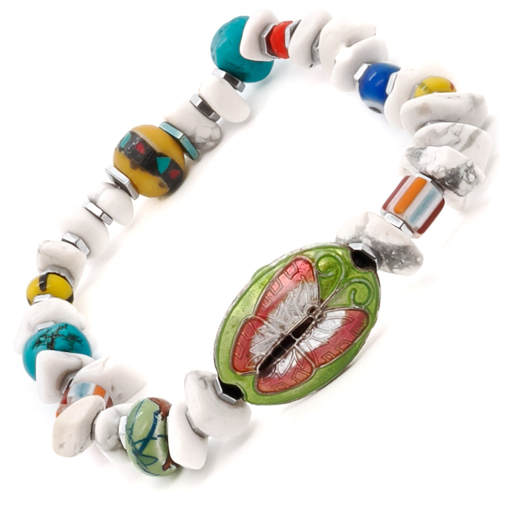 This bracelet features white nugget howlite beads, colorful African beads, a brass butterfly charm, silver hematite spacers, a turquoise nugget bead, an orange crystal bead, and a glass evil eye bead. It is 6.5 inches on a stretchy cord.