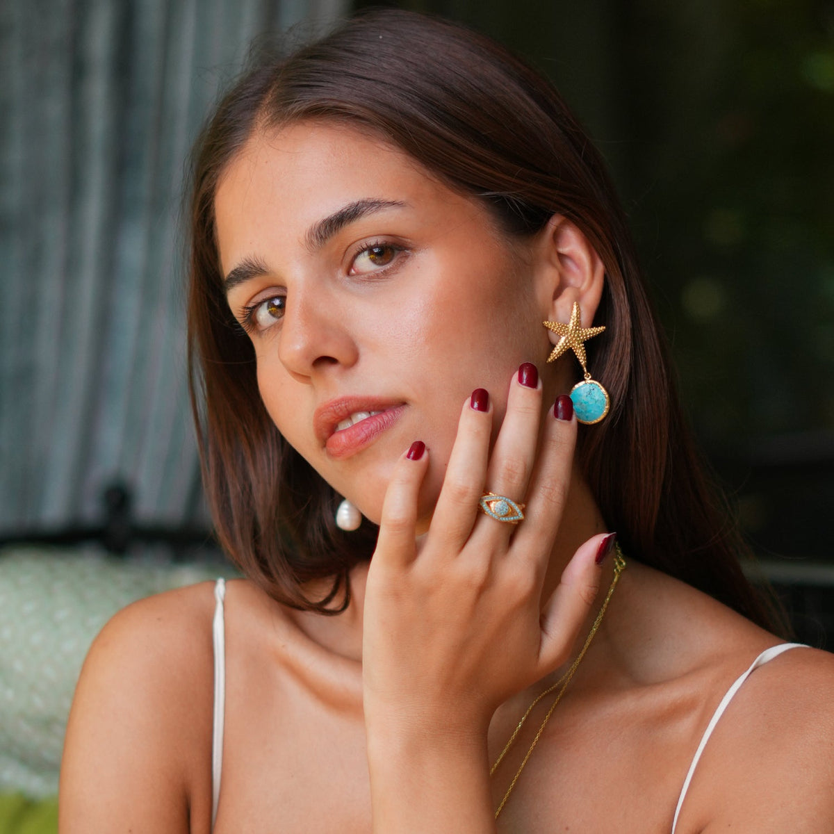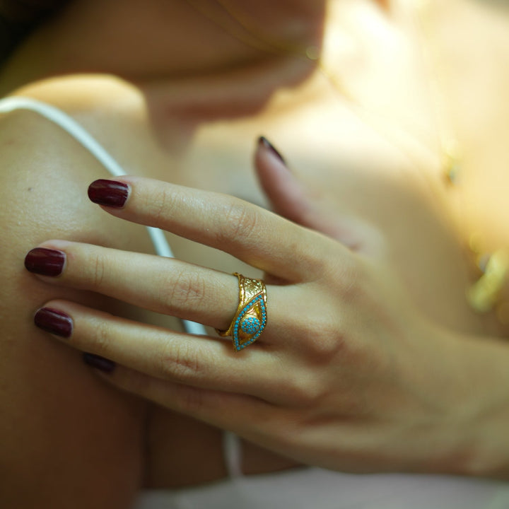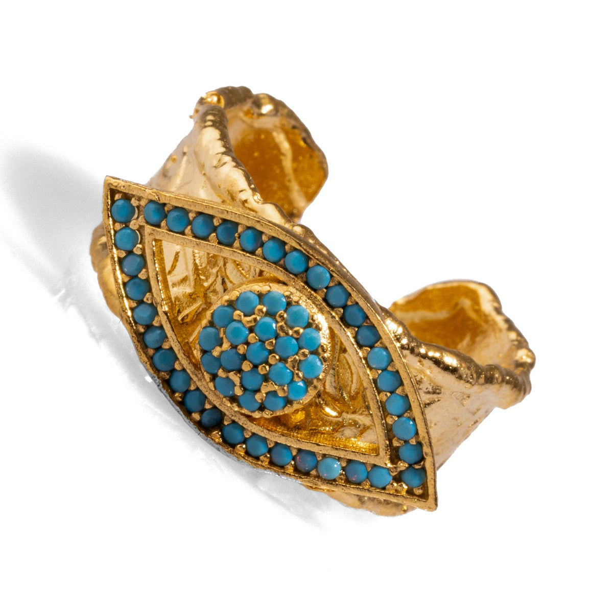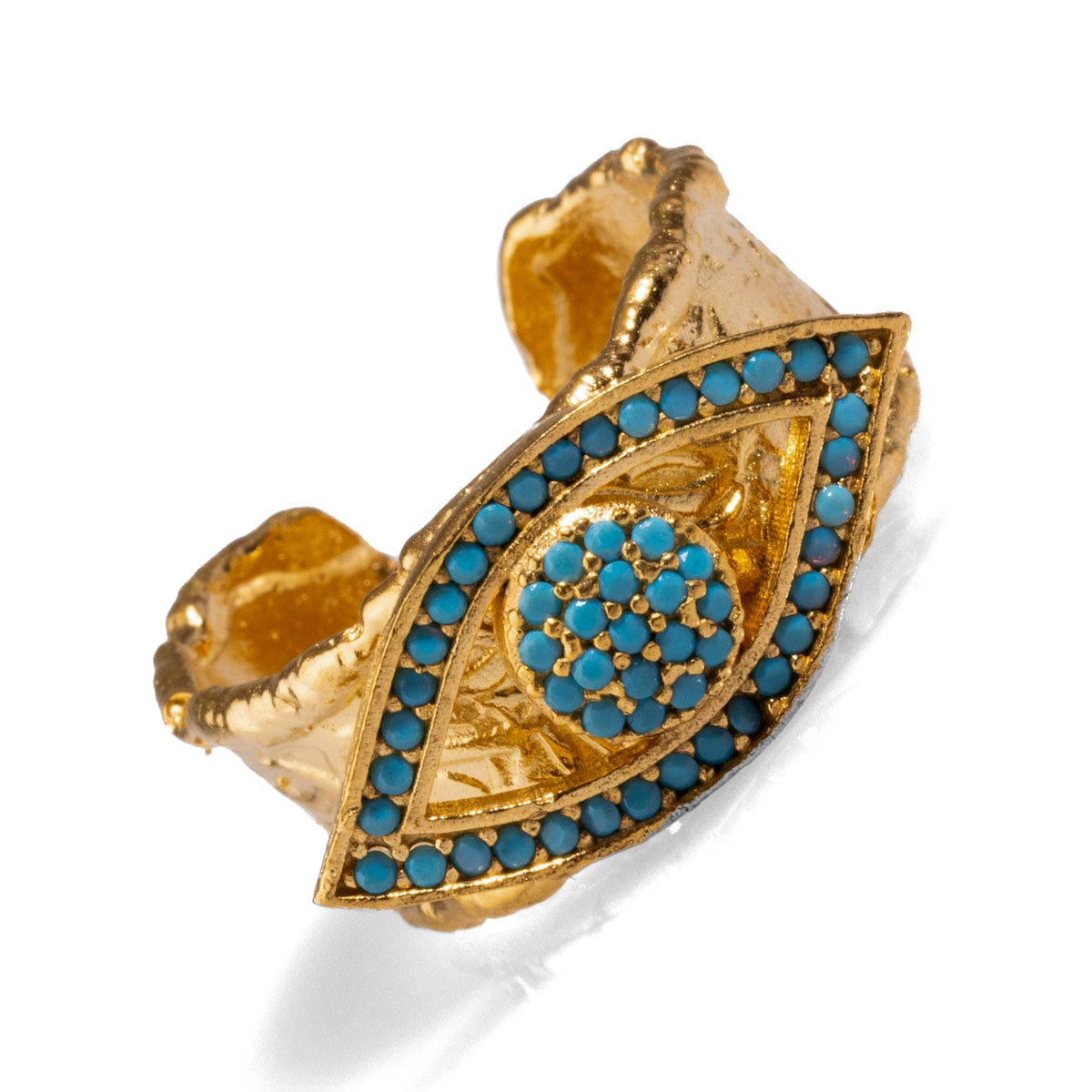This adjustable ring is crafted from high-quality brass plated with 24k gold and features a turquoise evil eye stone.