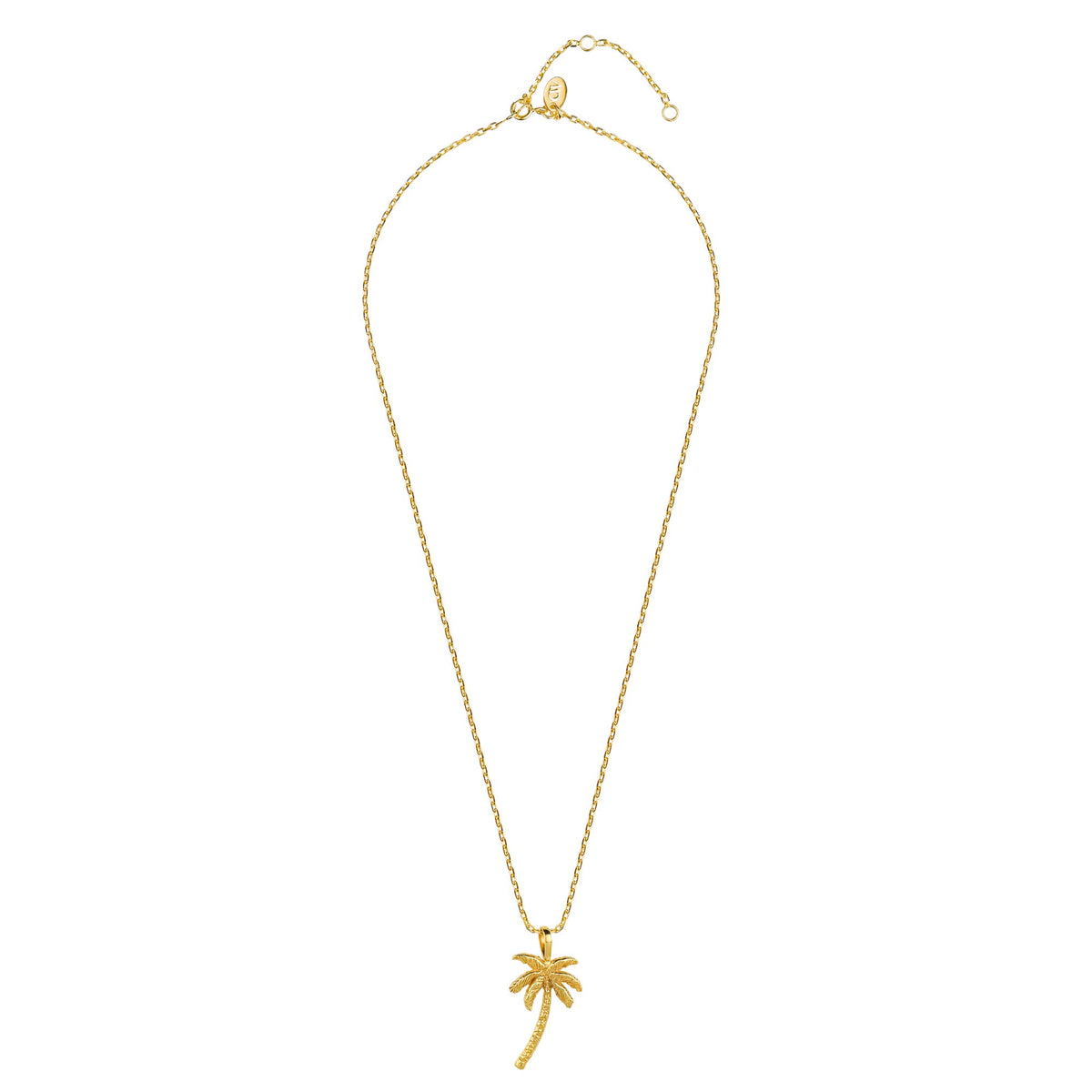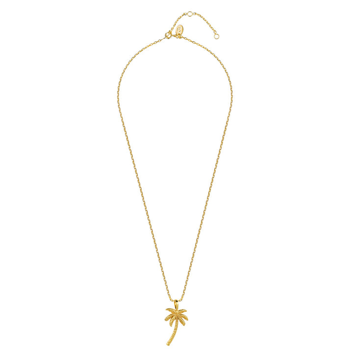 Handmade in 24K gold-plated recycled brass. Features hand-etched palm tree pendant.