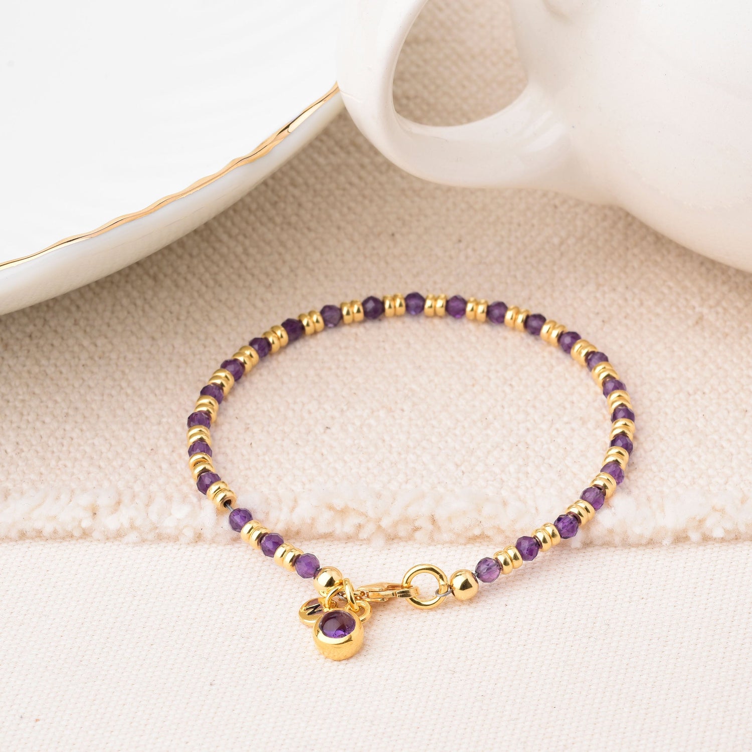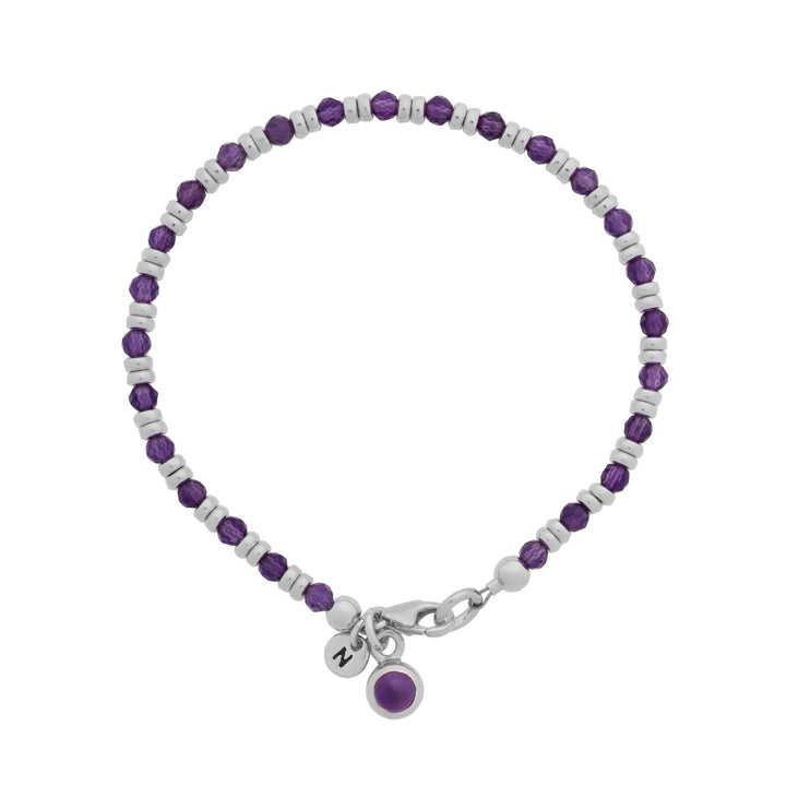 This bracelet is available in eco sterling silver or gold-plated eco sterling silver. It features natural amethyst facet beads and an amethyst charm.
