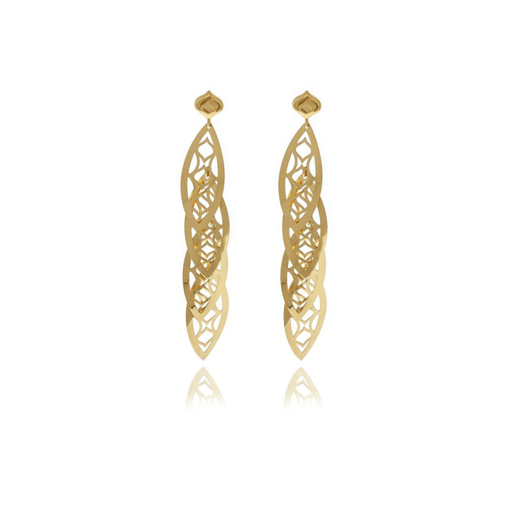 These earrings are cast from 24 karat gold over sterling silver with a 3-micron thickness. They are very light weight.