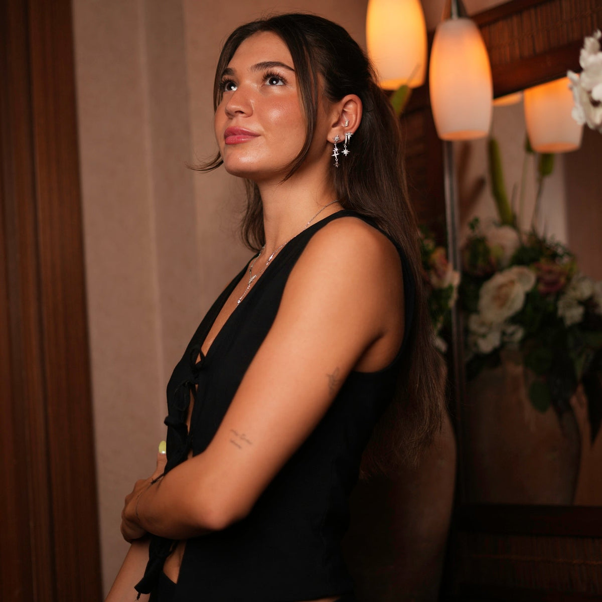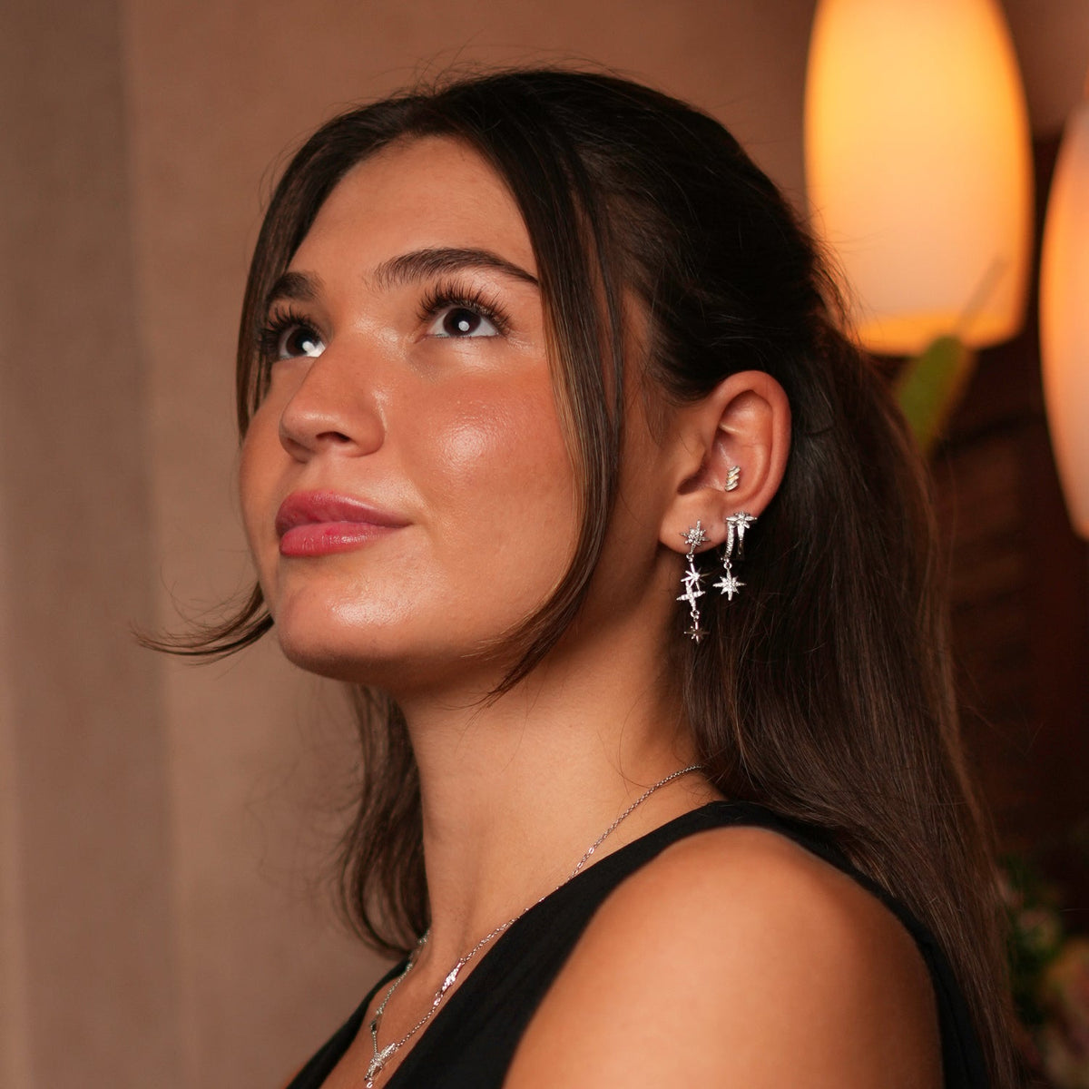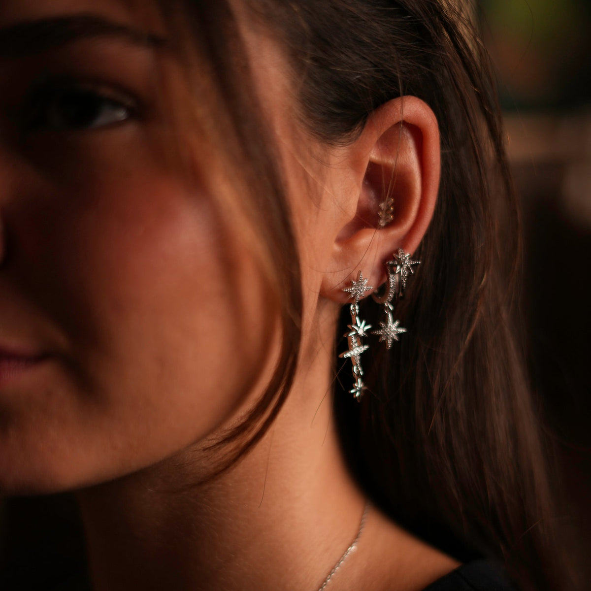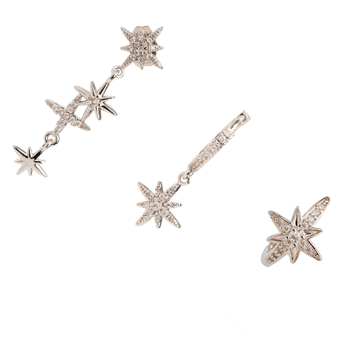 This Celestial Trinity Silver & Diamond Earring Set by Ebru Jewelry captures the mystique of the cosmos. With three star-shaped earrings shimmering with CZ diamonds, the set offers versatile styling—whether clustered on one ear for a bold celestial statement or split across both for balance. Infused with spiritual symbolism, it’s designed to sparkle with cosmic energy while elevating any look.