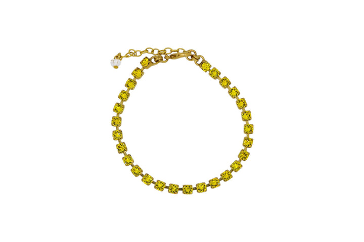 This Yellow Tennis Bracelet in Gold by Vickisarge radiates joy and brilliance with its glowing line of golden Austrian crystals. Combining timeless sophistication with a playful twist, it’s the perfect accent for day-to-night styling.