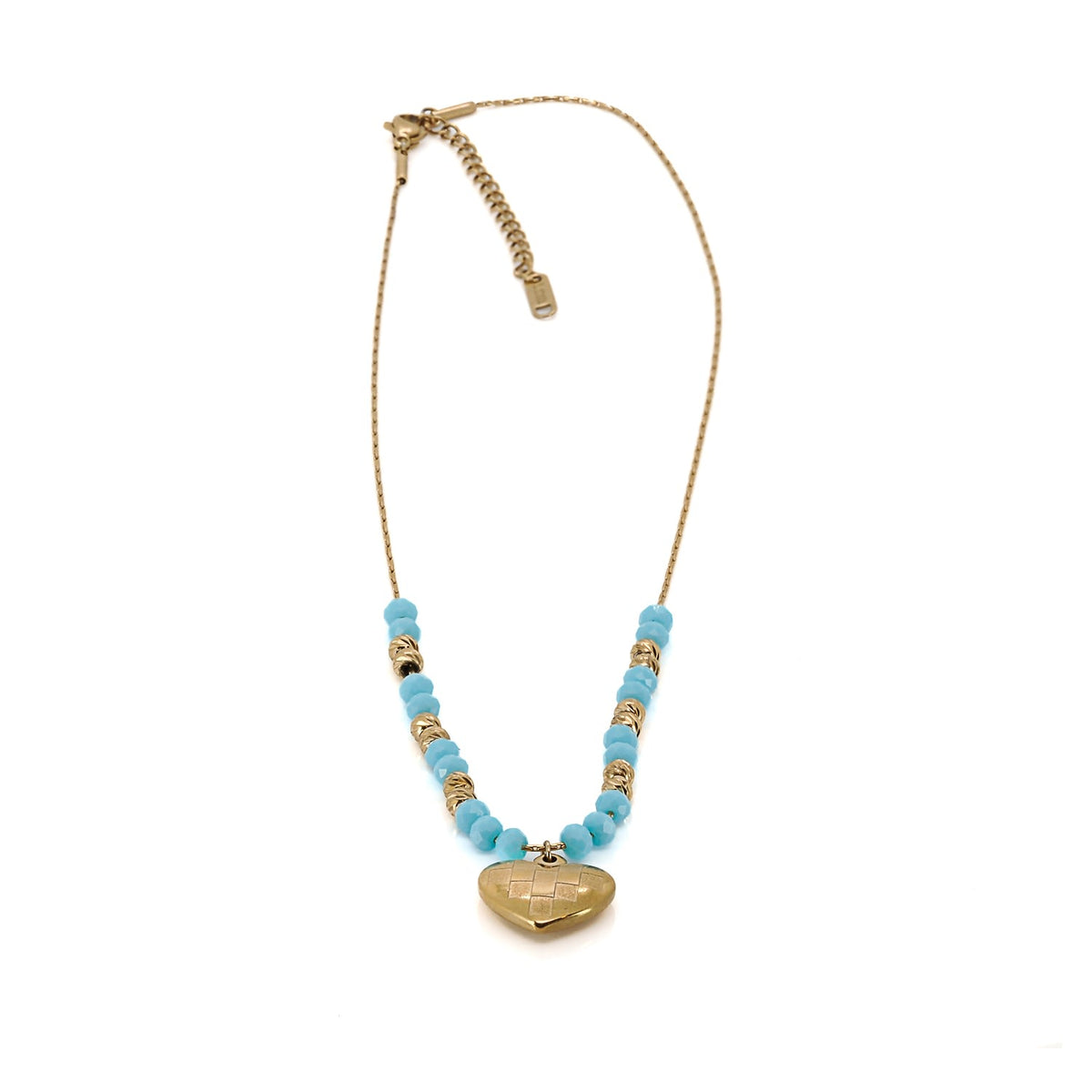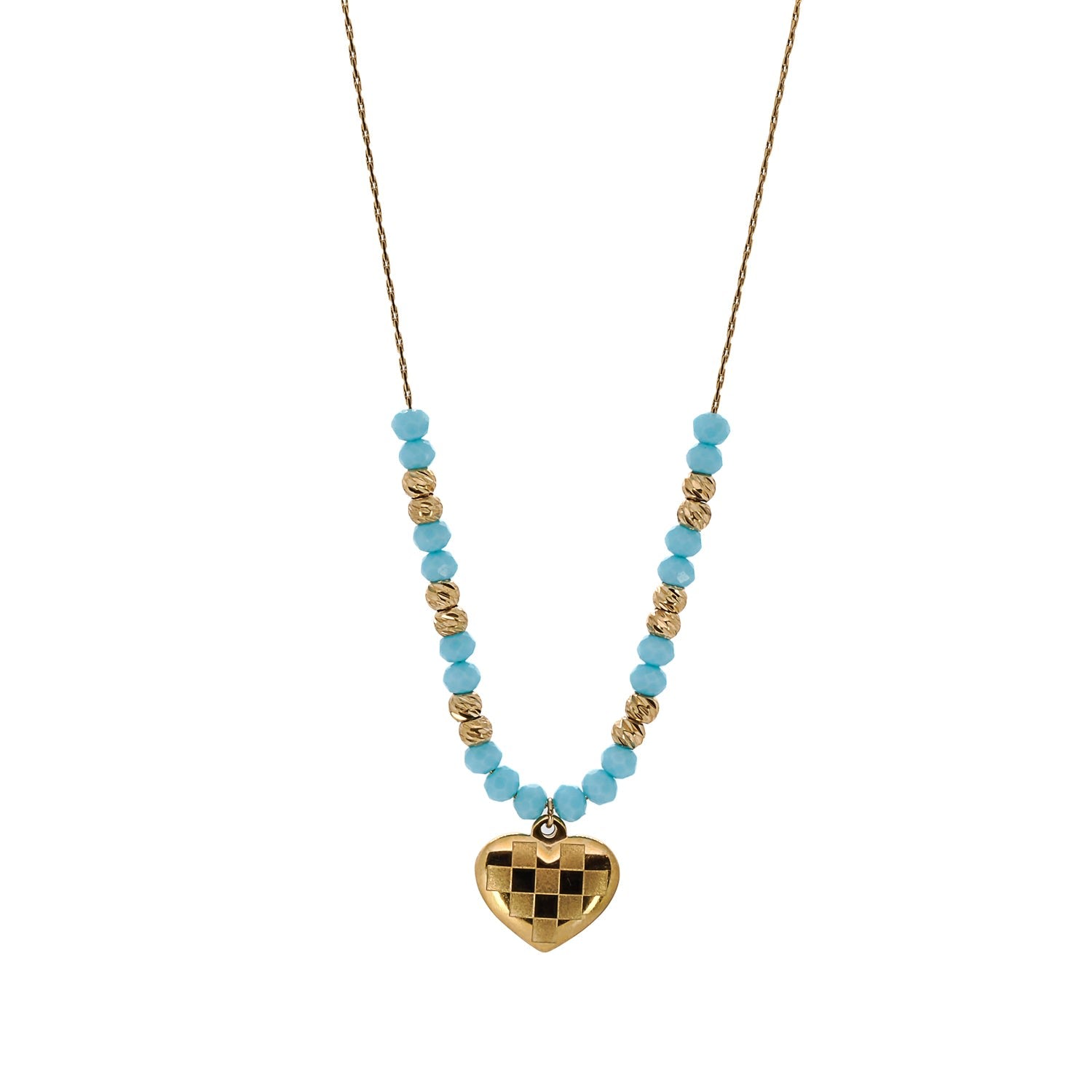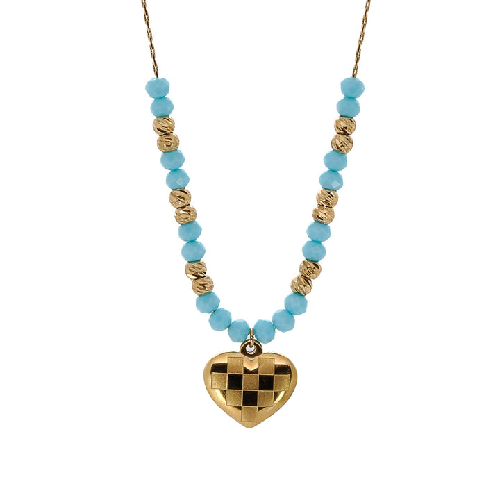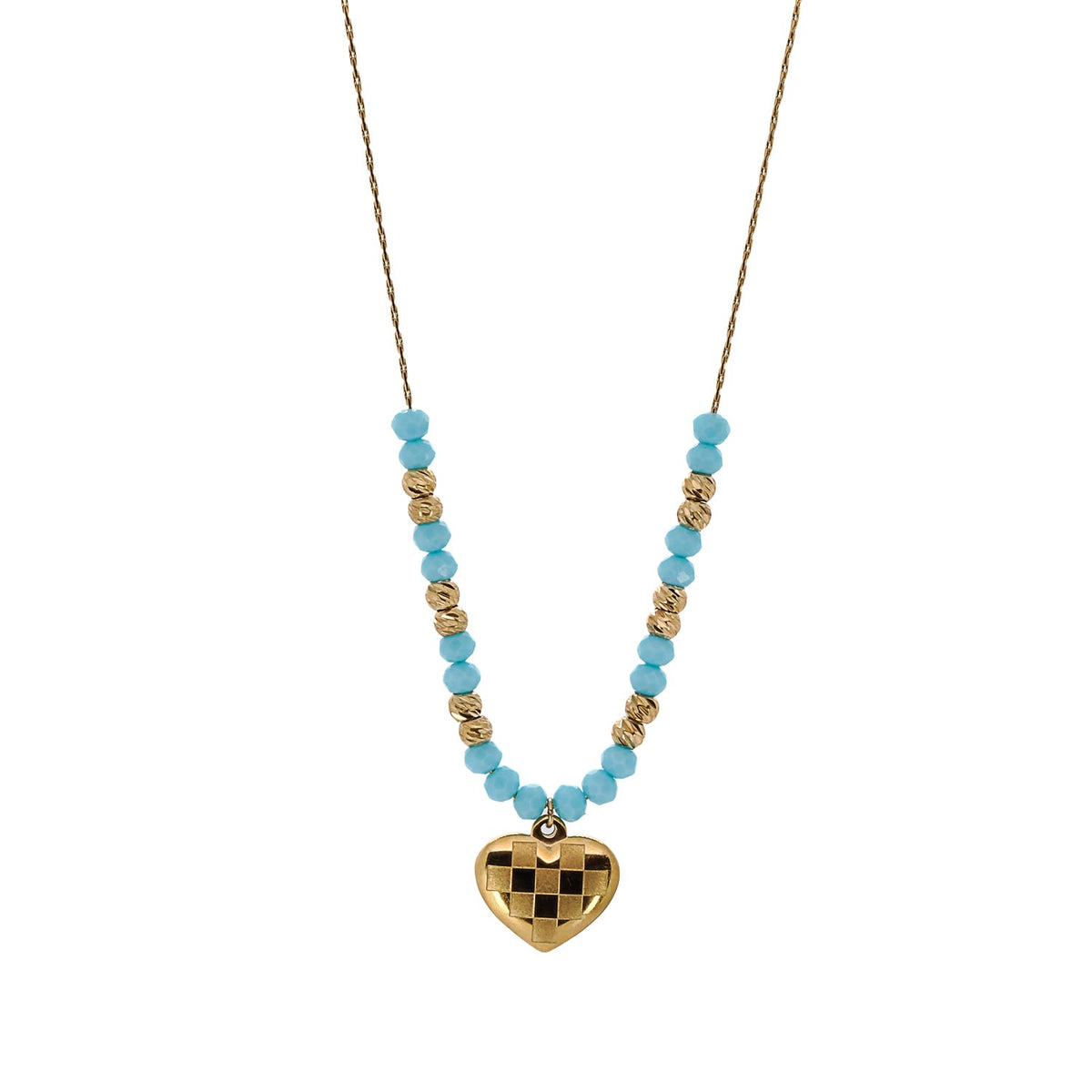 Stainless steel chain plated in gold with blue crystal beads; gold-plated stainless steel checker-pattern heart pendant; necklace length 16" + 2" extender; pendant 0.7" x 0.7".