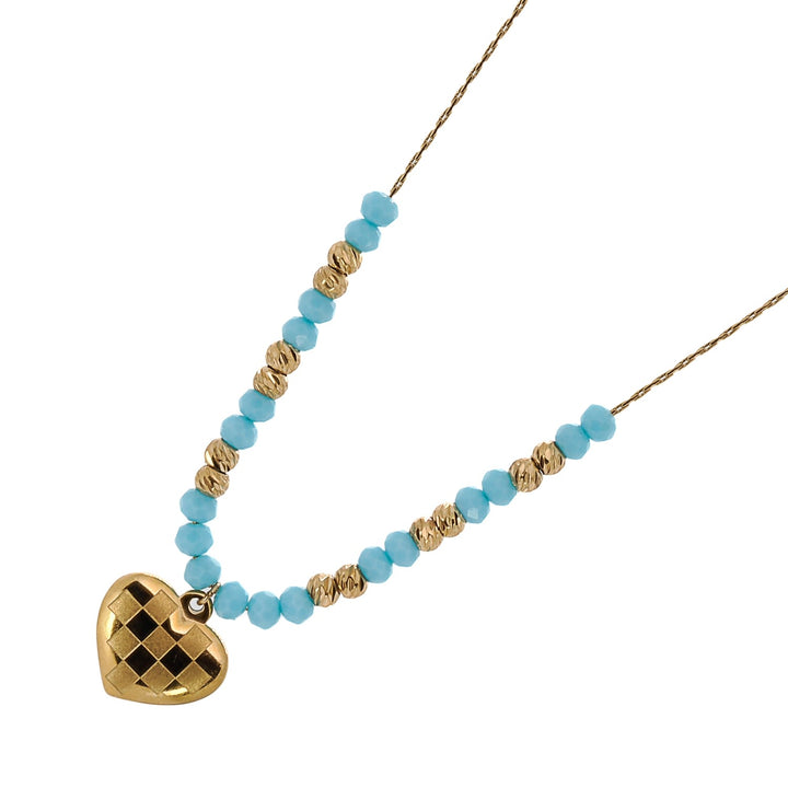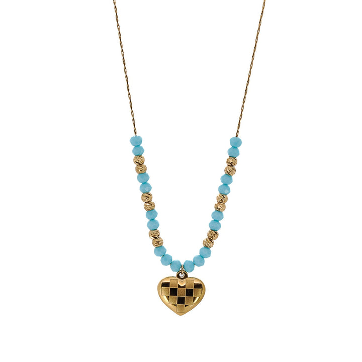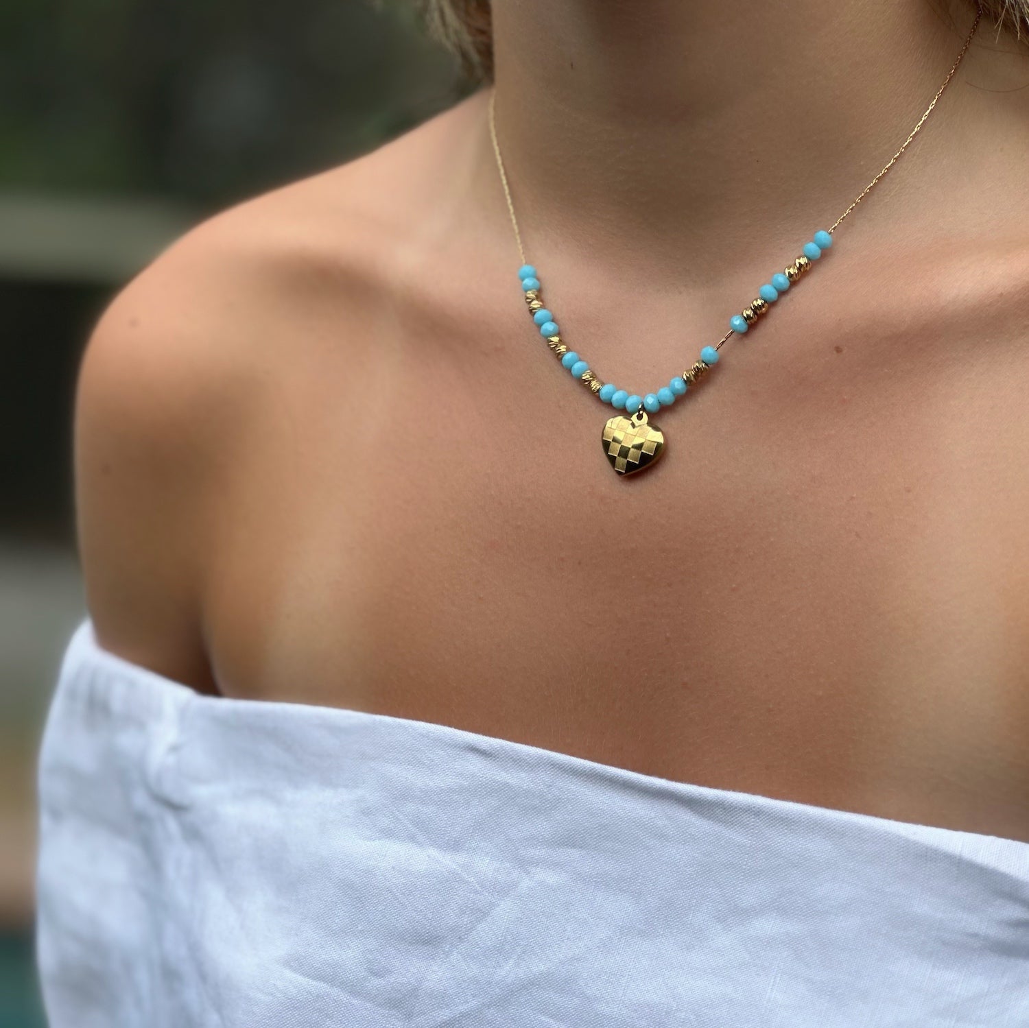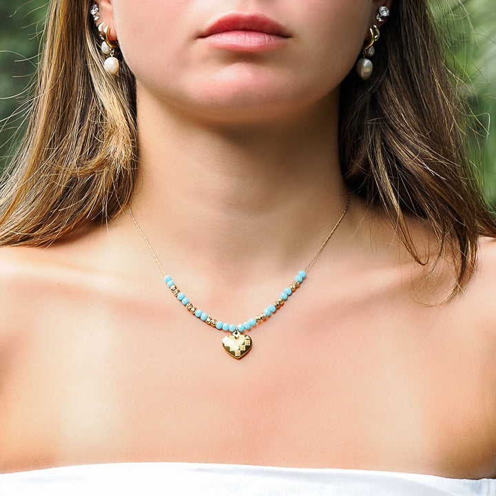 This Love Heart Pendant Turquoise Color Necklace by Ebru Jewelry symbolizes love, depth, and serenity. A checker-patterned heart pendant glows in turquoise blue against golden accents, radiating warmth and harmony. Its vibrant design adds charm and meaning to any ensemble.