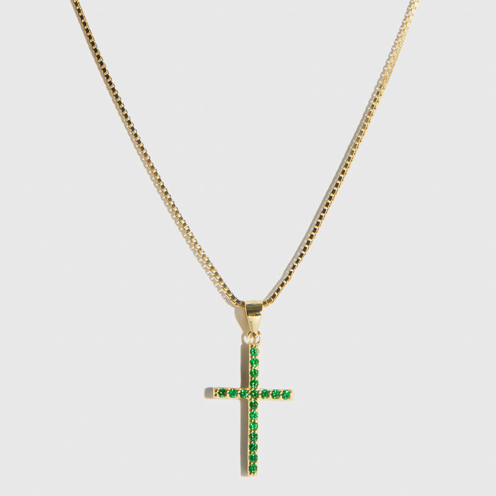 This reversible cross is crafted from gold vermeil and 925 sterling silver with a choice of a clear or emerald green stone. It has a diameter of 25mm x 15mm and comes with a 20" chain.