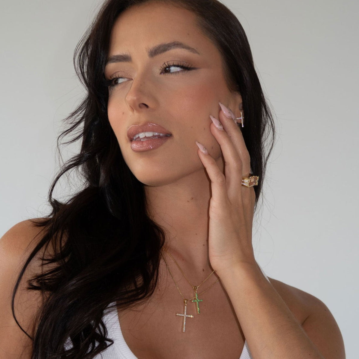 This Holy Grail Small Gold by Drae Collection is a versatile and stylish accessory designed for the fashion-conscious. The reversible cross features a sleek gold base that can be switched to a silver side, offering two distinct looks. You can also choose between a clear stone and an emerald green side, allowing for a unique look every day. It's a high-quality, long-lasting piece that is resistant to tarnish and water, perfect for your everyday wardrobe.