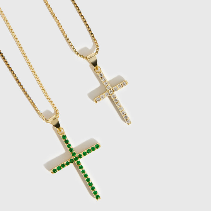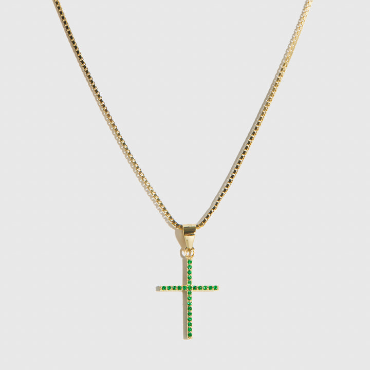 This reversible cross is crafted from gold vermeil and 925 sterling silver with a choice of a clear or emerald green stone. It has a diameter of 25mm x 15mm and comes with a 20" chain.