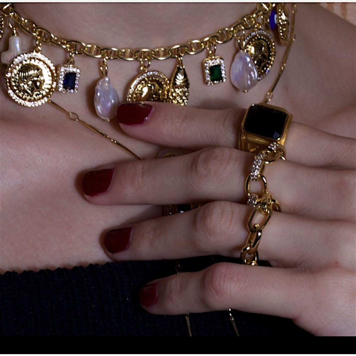 This Odyssey Coin Charm Necklace by Alexie of Athens is a wearable adventure. This piece is a storybook of treasures, featuring intricate coin medallions, freshwater pearls, vibrant gemstone accents, and playful talismans like a fishtail and an evil eye. Made from 14K Gold Filled material, each charm symbolizes protection, abundance, and exploration. This necklace is perfect for layering or making a bold standalone statement, inviting you to embrace the beauty of the unexpected.