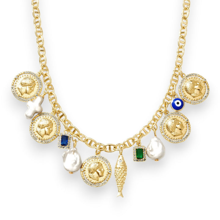 This necklace is made of 14K Gold Filled material. It features coin medallions, freshwater pearls, and various gemstone accents and talismans.