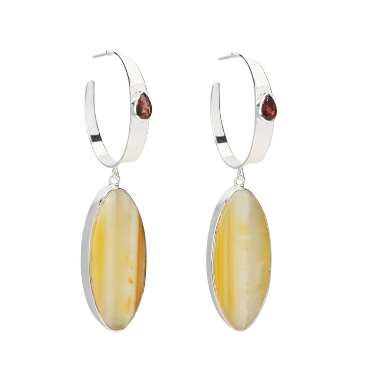 These hoop earrings are made of 925 sterling silver. The oval drop pendant features semi-precious agate and pink tourmaline stones.