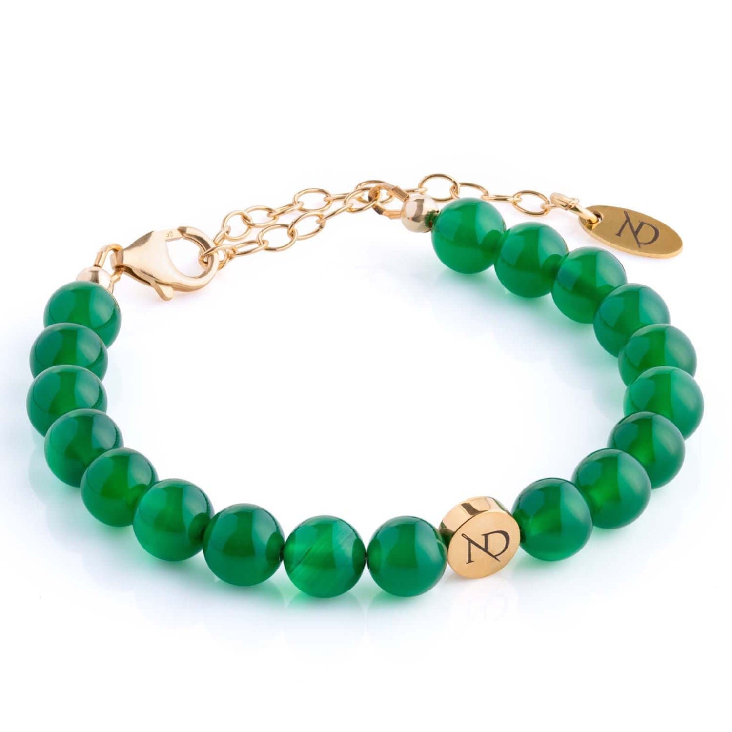 8mm natural green agate gemstone beads; 14k recycled gold extender chain (2”/5cm); adjustable length 6”–8”.
