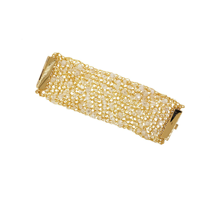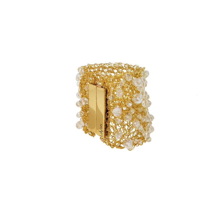 This Clear & Gold Aurora Large Handmade Bracelet by Lavish by Tricia Milaneze is a statement cuff of shimmering artistry. With hand-crocheted gold-filled wire adorned with sparkling crystals, it offers a bold yet feather-light design. Both glamorous and comfortable, it’s an unforgettable piece of wearable craftsmanship.