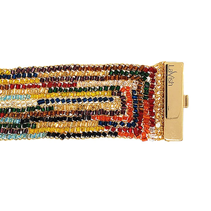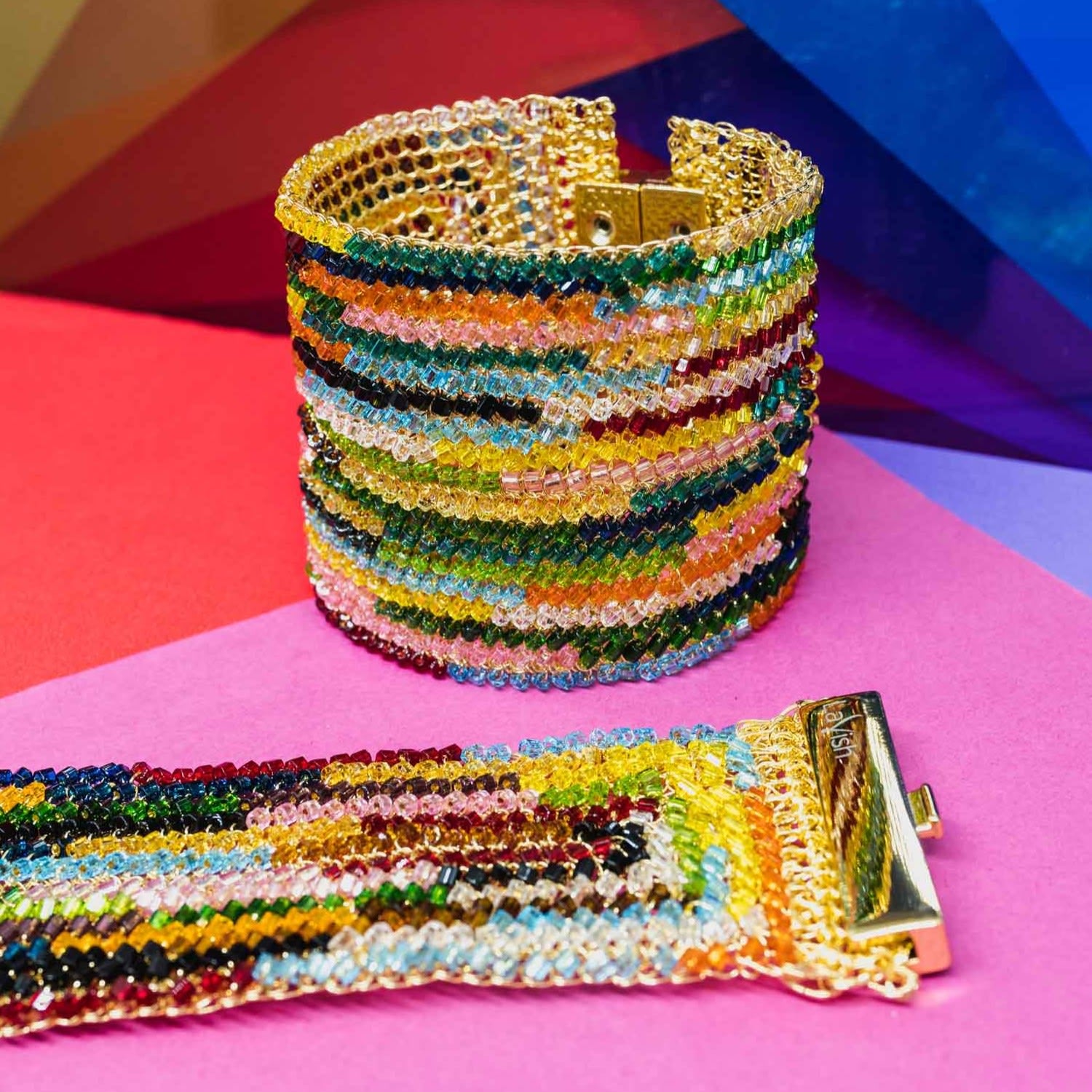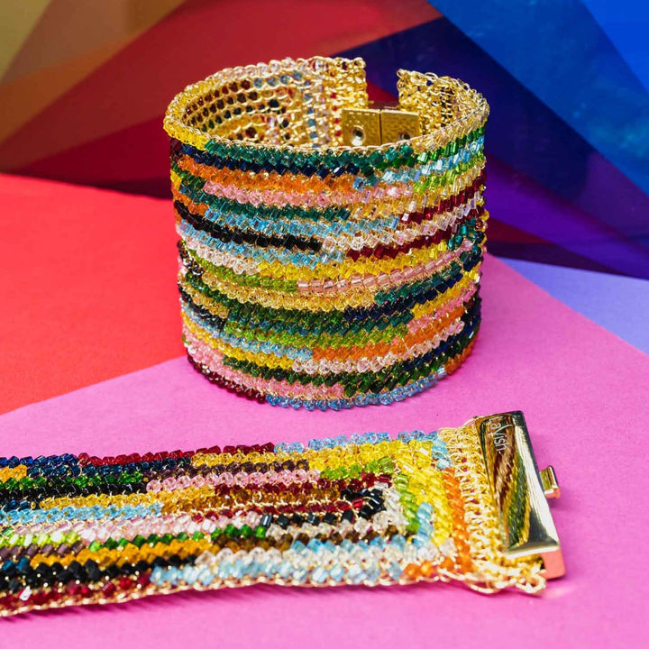 This Multicolor Signature Handmade Bracelet by Lavish by Tricia Milaneze is a vibrant celebration of artistry. Hand-crocheted with 18k gold-filled wire, it shimmers with multicolored crystals and beads, creating a dynamic cuff that is light yet impactful. Finished with a magnetic clasp, it combines craftsmanship with everyday ease, embodying joyful luxury.