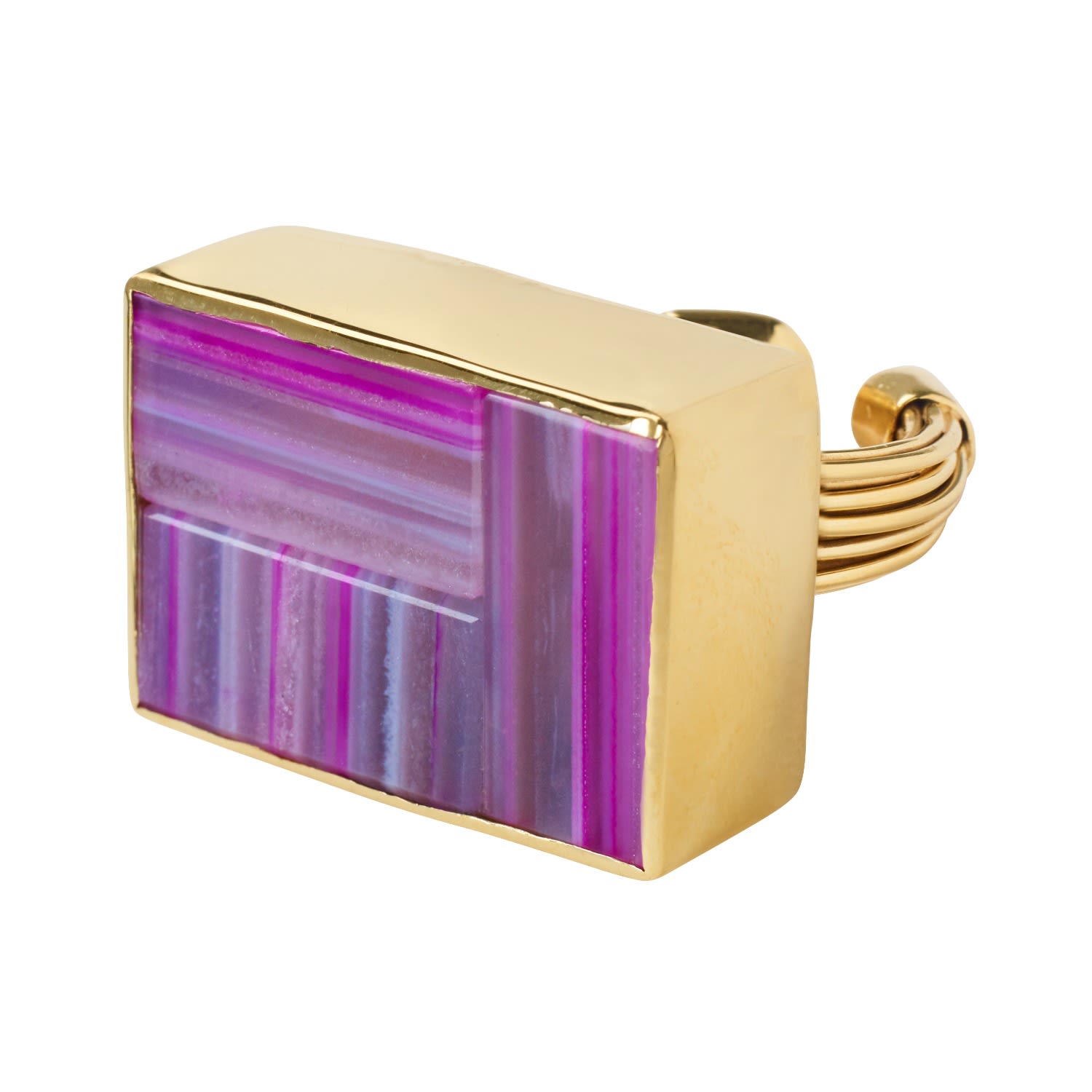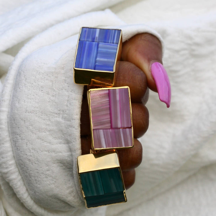 This ring is handcrafted and features three chunky agate blocks. The adjustable band is made from brass with 18k gold plating.