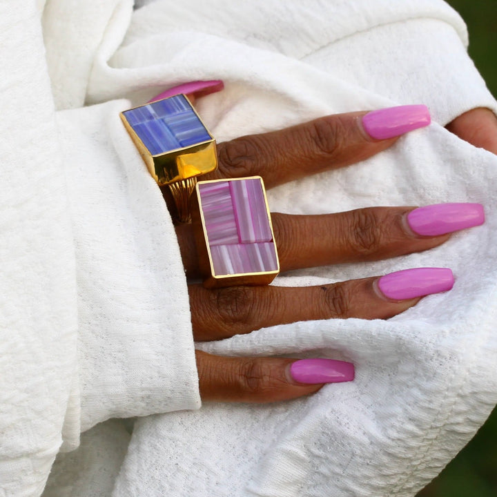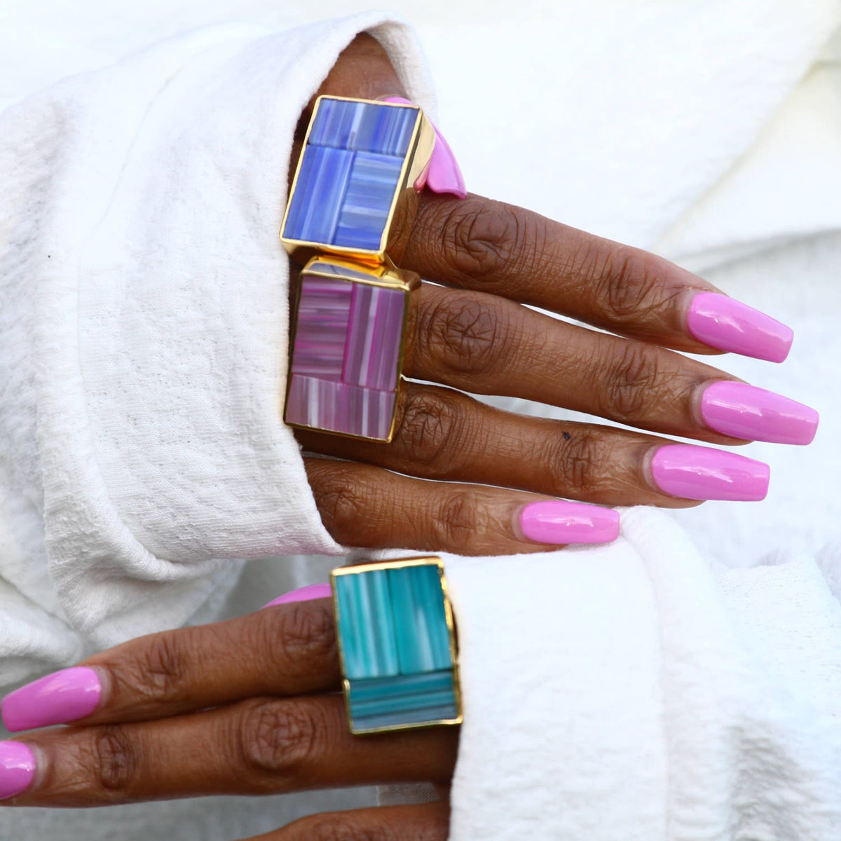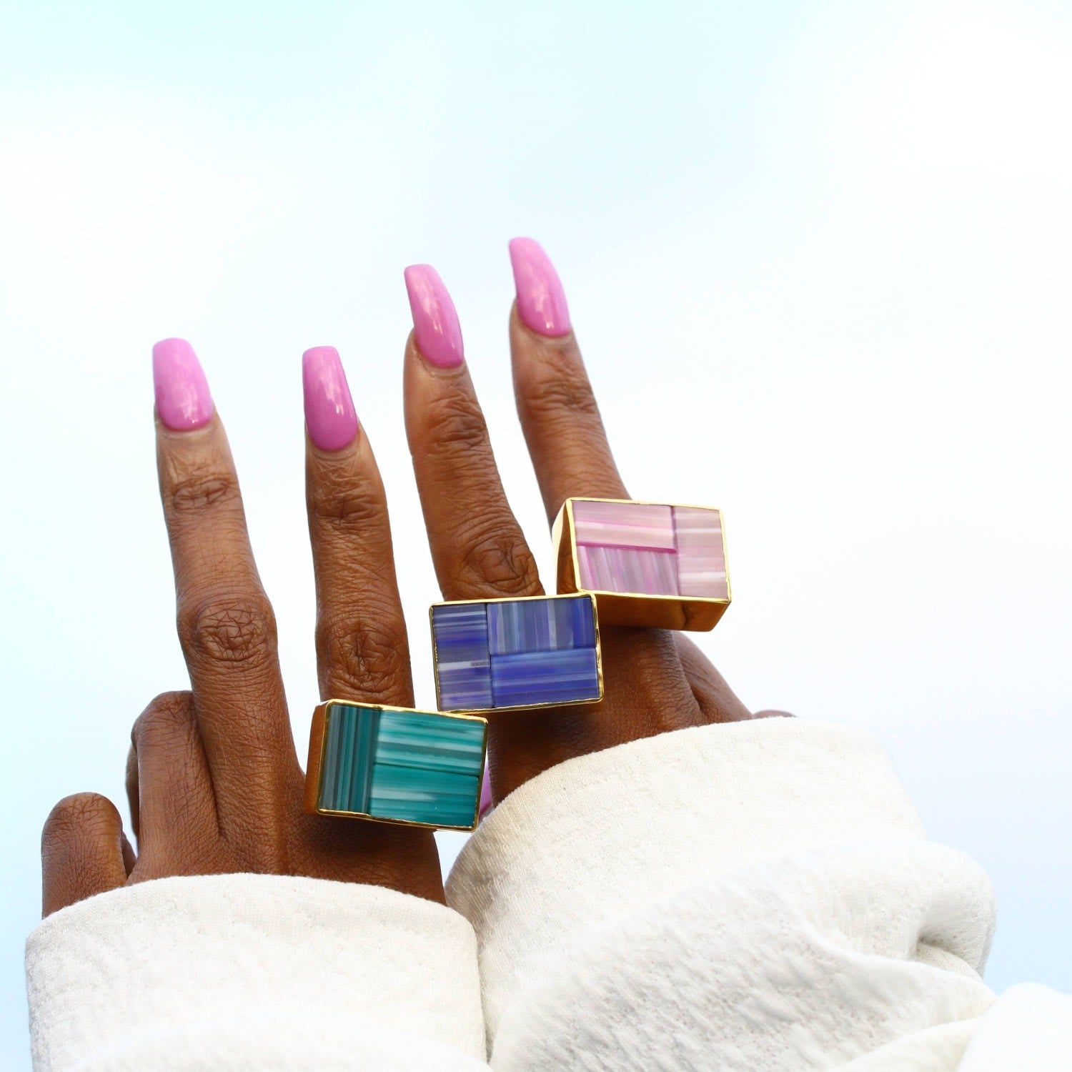 This Pale Pink Gemstone Adjustable Block Ring by Yaa Yaa London is a bold and elegant accessory. This handcrafted ring features three chunky agate blocks in shades of pale pink. The adjustable band is suitable for most finger sizes, from small to extra large. This limited edition piece is a perfect statement ring that adds a unique touch of color and style to your look.