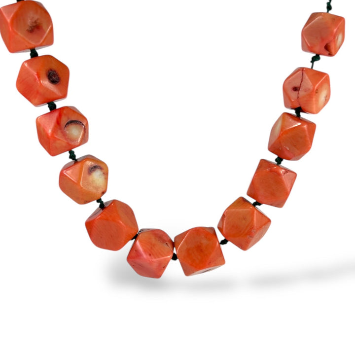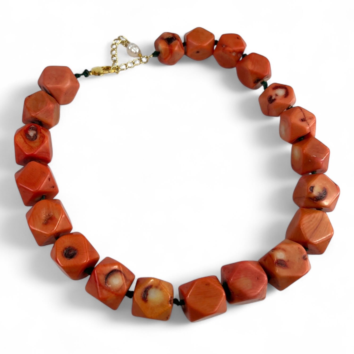 This necklace is handcrafted using coral, natural freshwater pearls, and gold-plated brass materials. The length is 40-45 cm with a 10 cm extension chain.