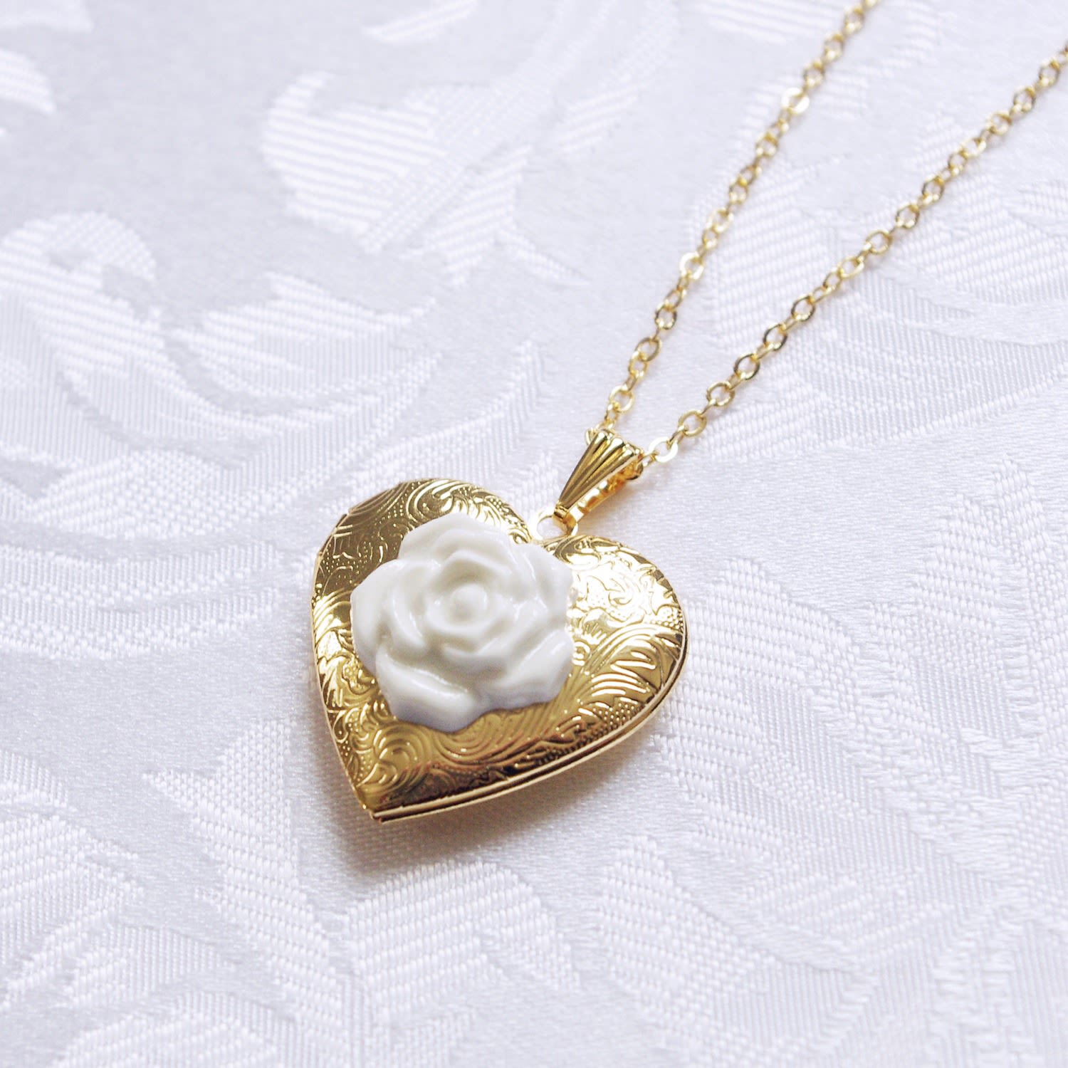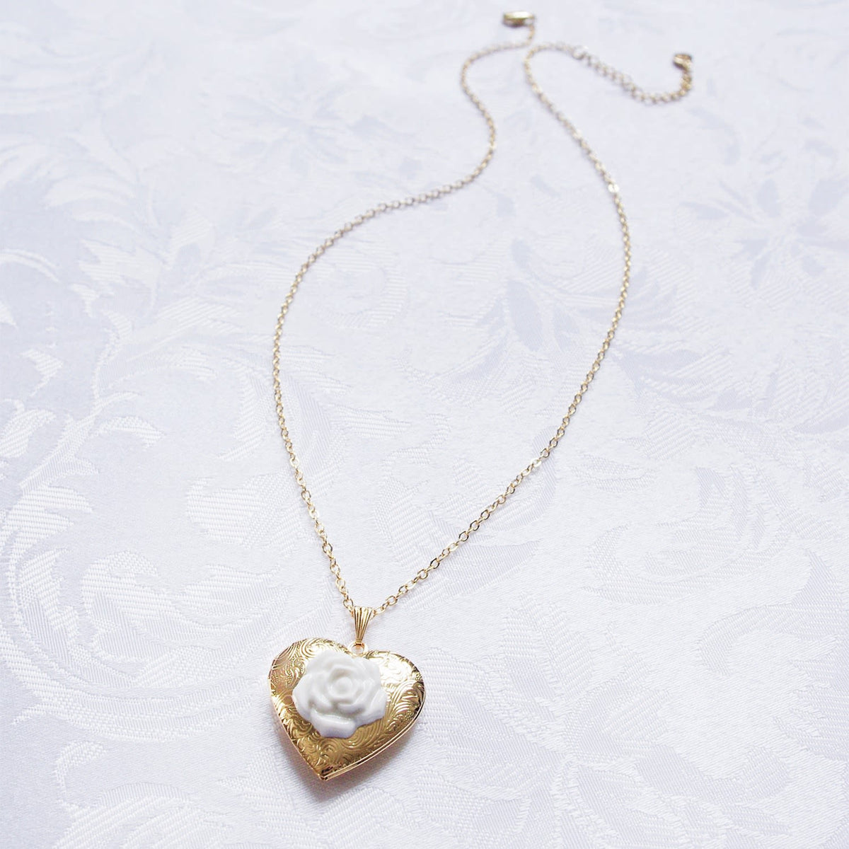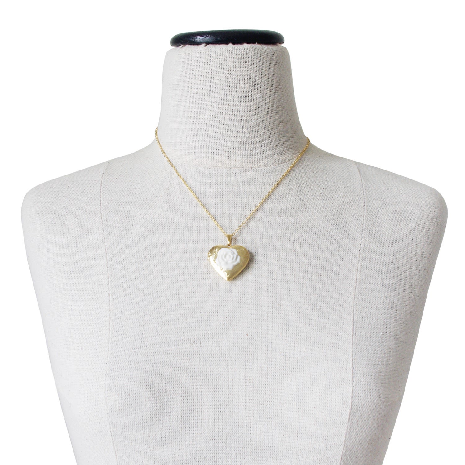 This necklace features a gold-plated brass locket and chain, and a handmade porcelain rose cabochon.